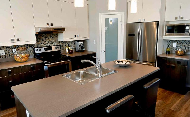 While the great room is huge, its finishes prevent it from feeling like a cavernous, featureless box. The kitchen features smart taupe laminate countertops and a combination of sambuca (dark brown) and off-white thermofoil cabinets, the latter being positioned over the stove to define the area in functional style along with a river rock-style backsplash.