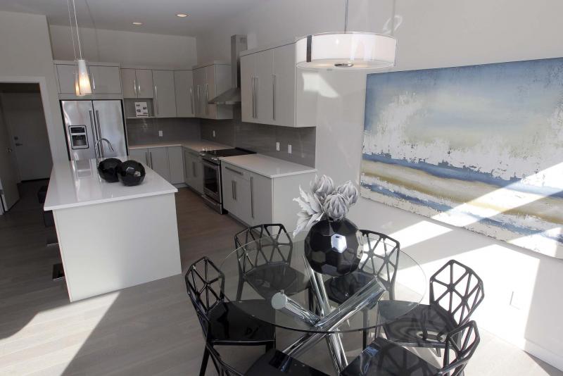 Add in a logical layout — each area, from the family room to dining area to kitchen — is not only spacious but well-defined, but a deft combination of modern and traditional hues and finishes make for a contemporary, yet warm area. "The walls are a modern off-white with a pair of (medium) taupe feature walls — one in the TV niche and the other around the two windows and patio door on the rear wall," he said. "The taupe feature walls tie in beautifully with the taupe (glass tile) backsplash in the kitchen, while light taupe maple cabinets go beautifully with the off-white countertops on the island and the taupe engineered hardwoods. The colour palette is really on-point."