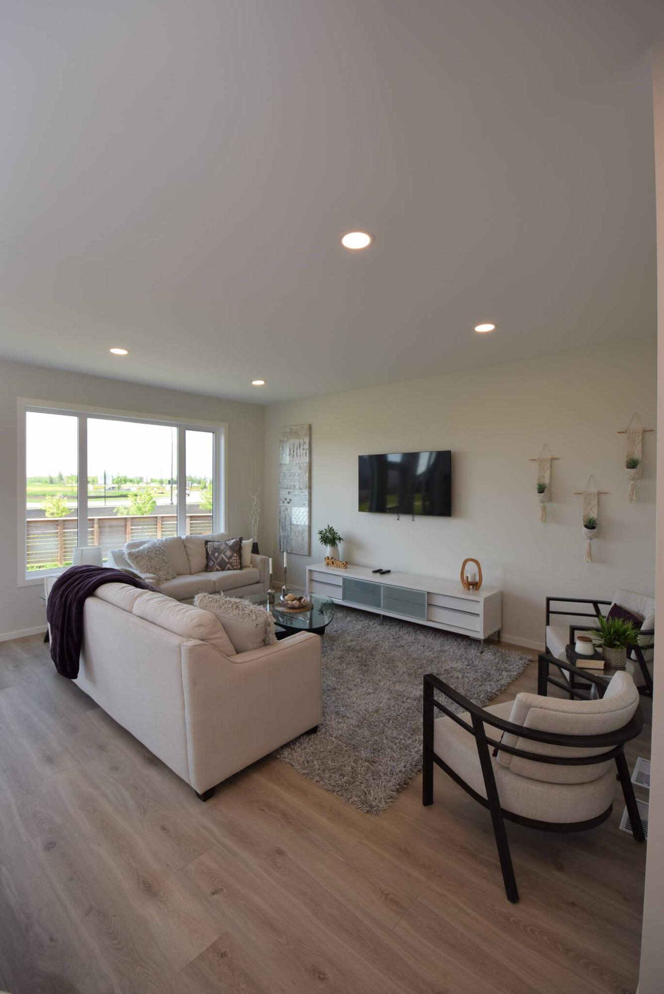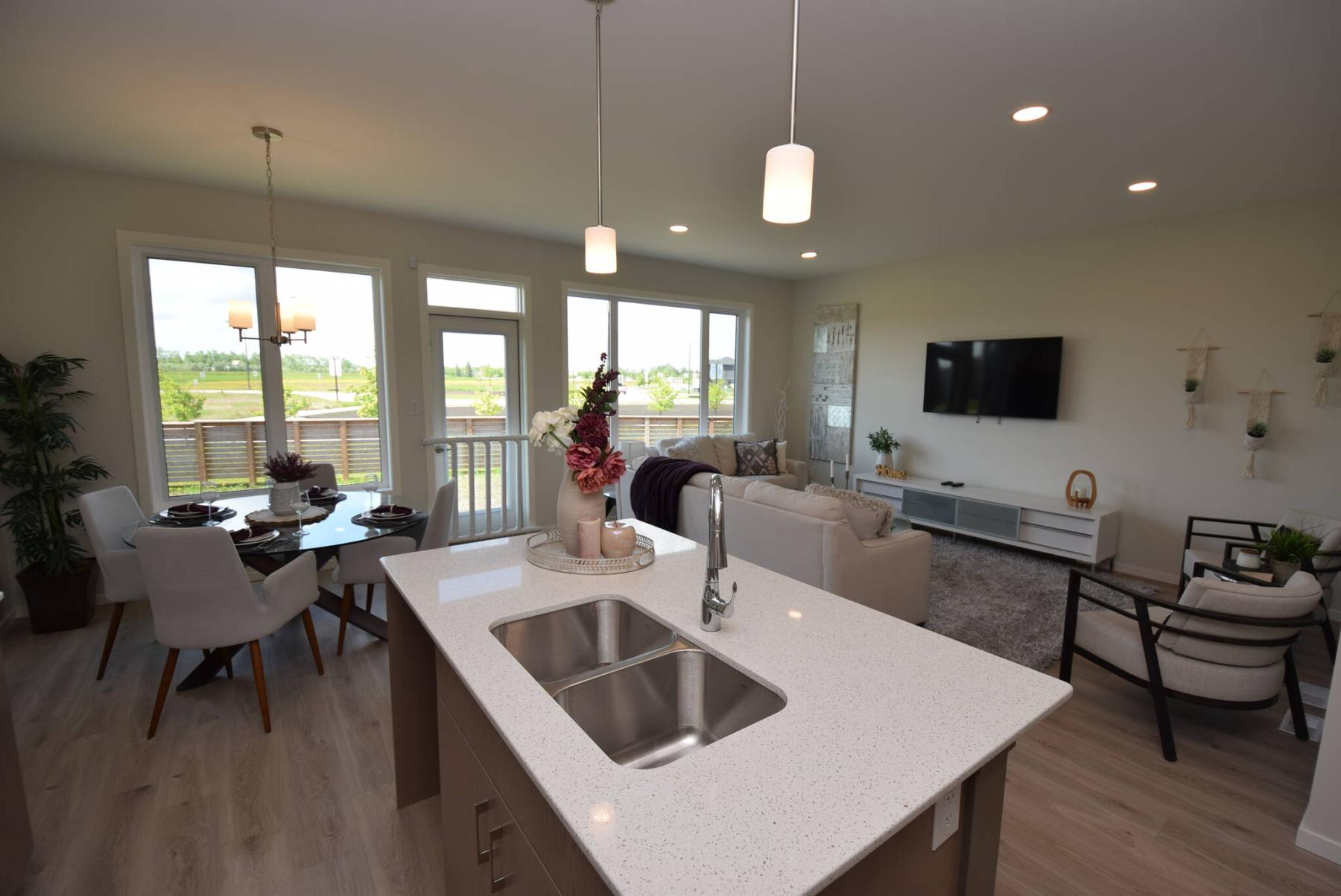 “The price of $419,900 includes upgraded finishes such as quartz countertops, luxury vinyl plank (LVP) flooring and oak shaker cabinets with 40-inch upper cabinetry,” notes Loewen. “You also get a stained-glass pantry door, an extended island breakfast bar top and stained capping and handrails.”