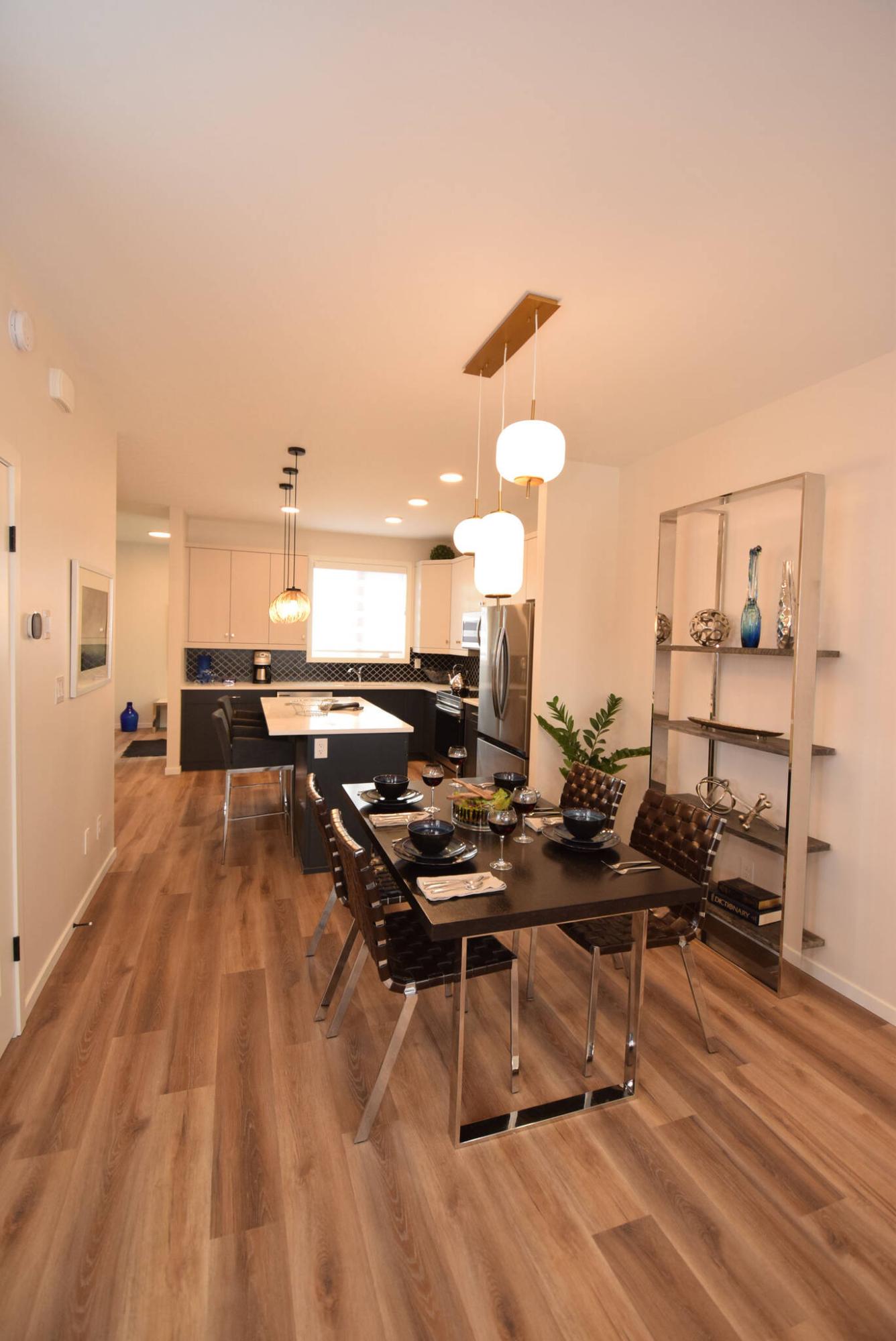 There’s plenty of style to be found in the dining/kitchen area of the Amber, a two-storey, 1,360-sq.-ft. plan by Hilton Homes which packs a ton of livability into a mid-sized package.