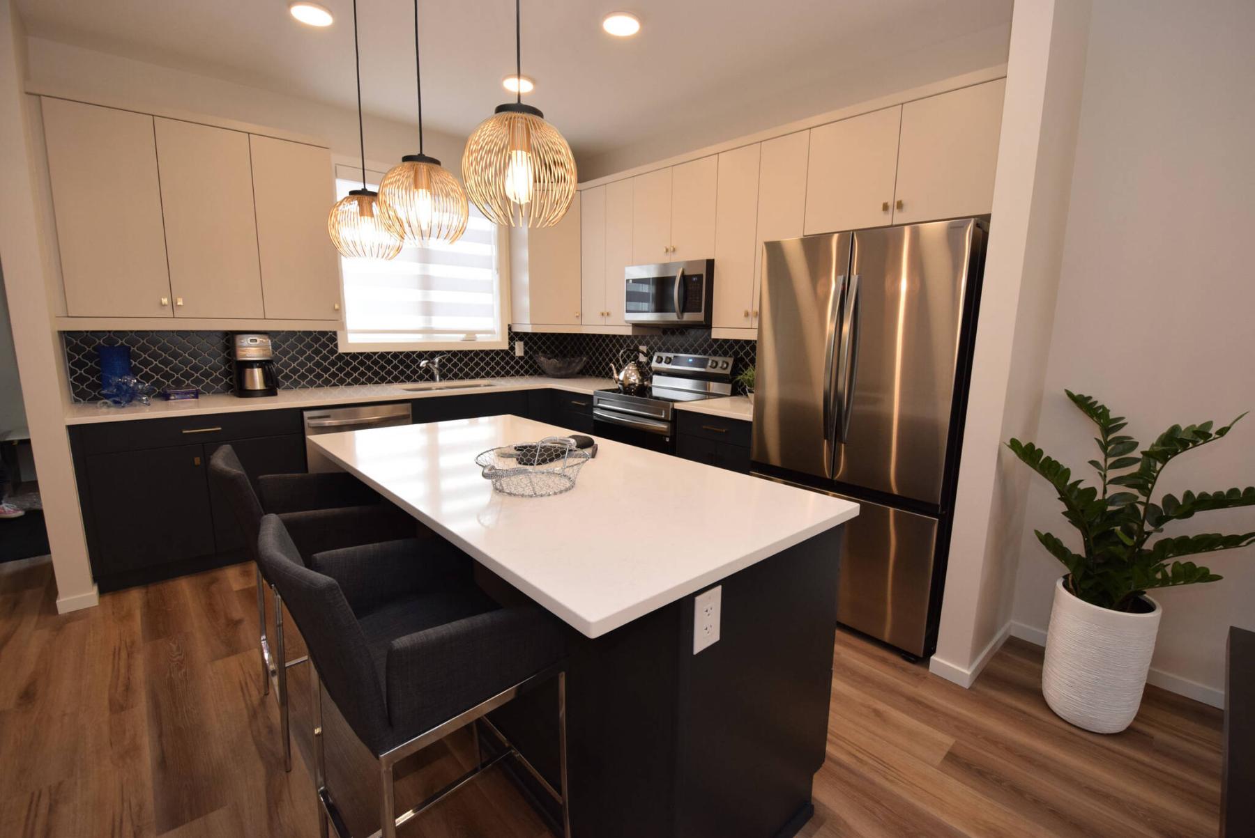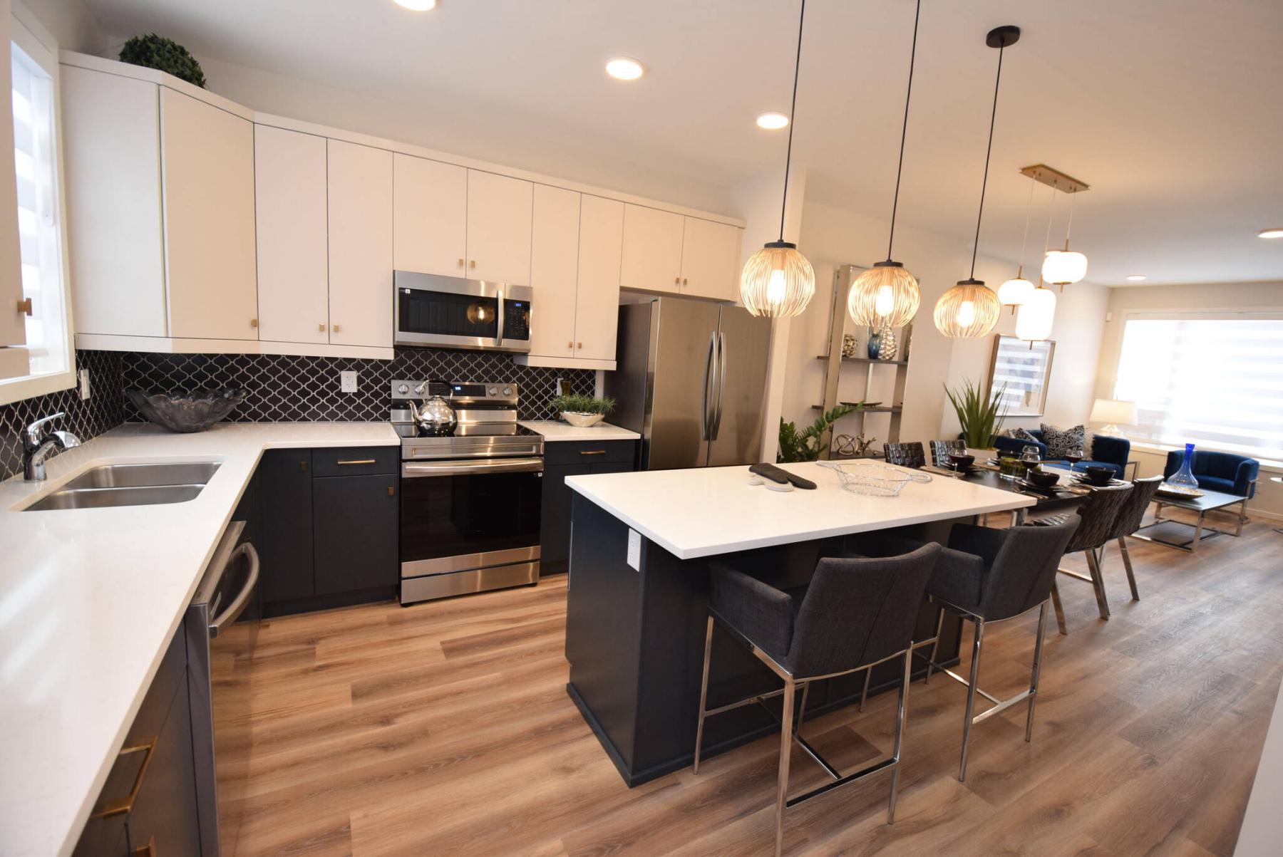 Two-tone grey cabinets, a stylish tile backsplash, elegant lighting and stainless-steel appliances give the show home kitchen a rich, upscale feel.