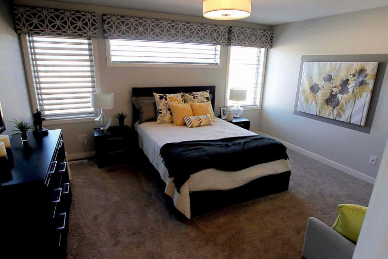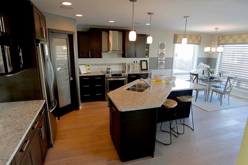 "The one thing people need to remember is that show homes come loaded with options," she said. "If you choose basic finishes -- vinyl flooring, laminate countertops, carpet and tile backsplash and accents (the dining room's buffet area is lined with tile, for example) -- and forgo fancy options such as an ultra-deluxe ensuite, you can purchase this home for around $450,000 on a nice lot in a great location."