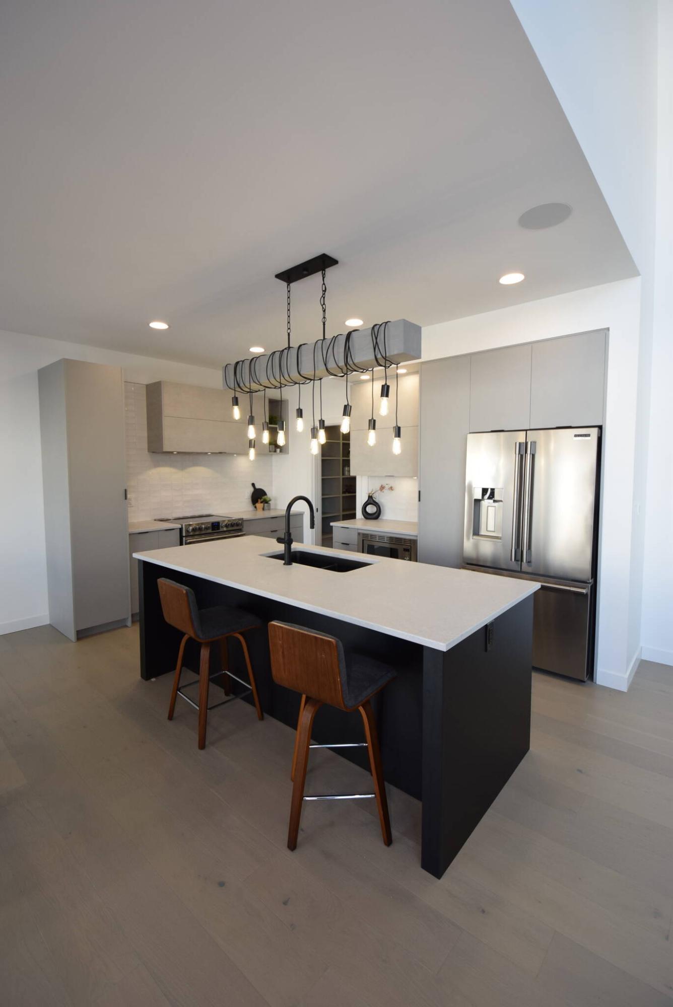 ”One of the first things you notice are the taupe quartz countertops, which have a matte finish. The upper cabinets over the range and microwave have a textured taupe wrap that was designed to match the countertops,” he says. “The island has a black base that contrasts perfectly with the grey cabinets around the fridge and range, and the white tile backsplash.”