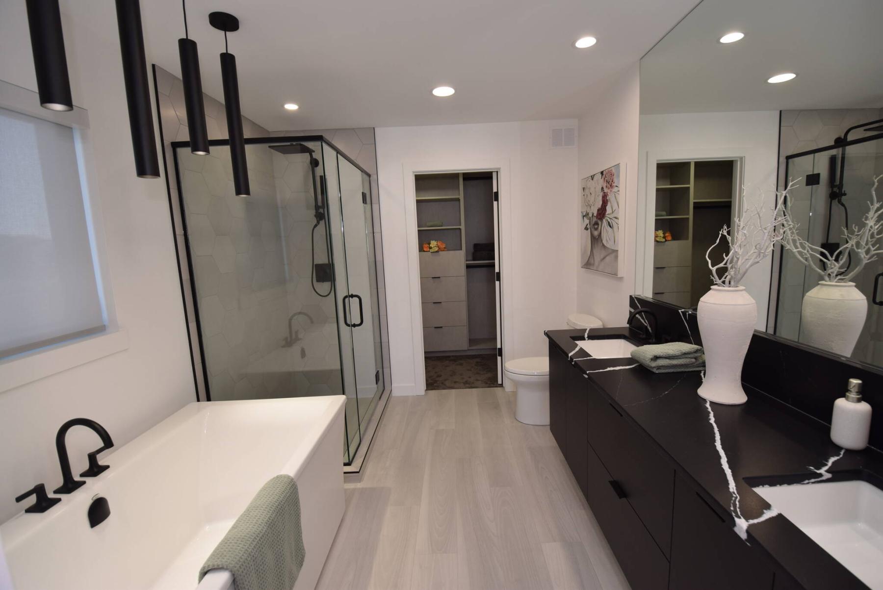 “It’s a large, light-filled space that comes with a deluxe ensuite with a black double vanity with incredible black and white quartz countertop, free-standing soaker tub and gorgeous walk-in shower with glass enclosure and hex tile surround. The walk-in closet behind it has a ton of built-in storage that has the same textured wrap as the kitchen cabinets.”