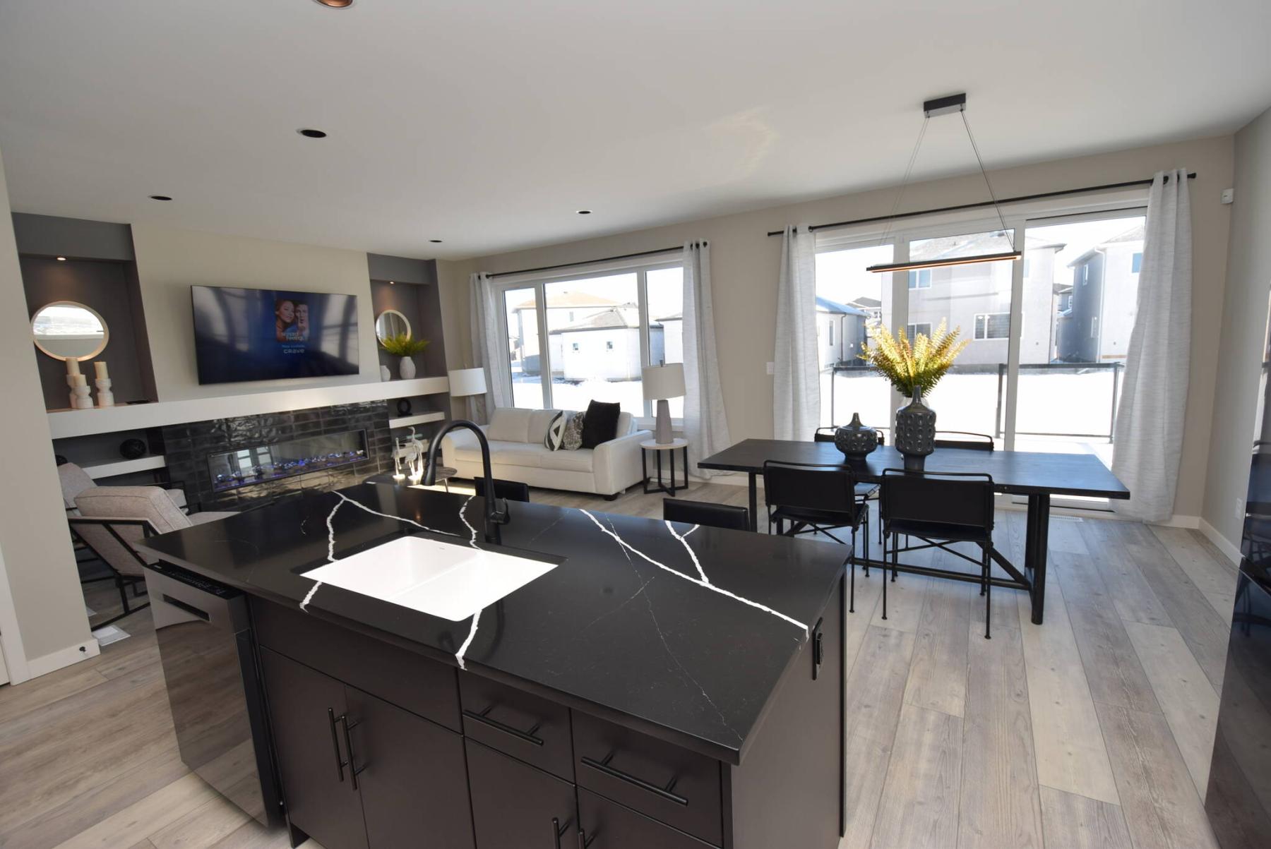 “The area was designed to have the versatility required to handle both daily family life and entertaining seamlessly,” he says. “At the end of the night, the grown-ups can visit in the great room, which is not only huge, but beautifully finished. The entertainment unit, which features a linear electric fireplace with tile surround, is gorgeous.”