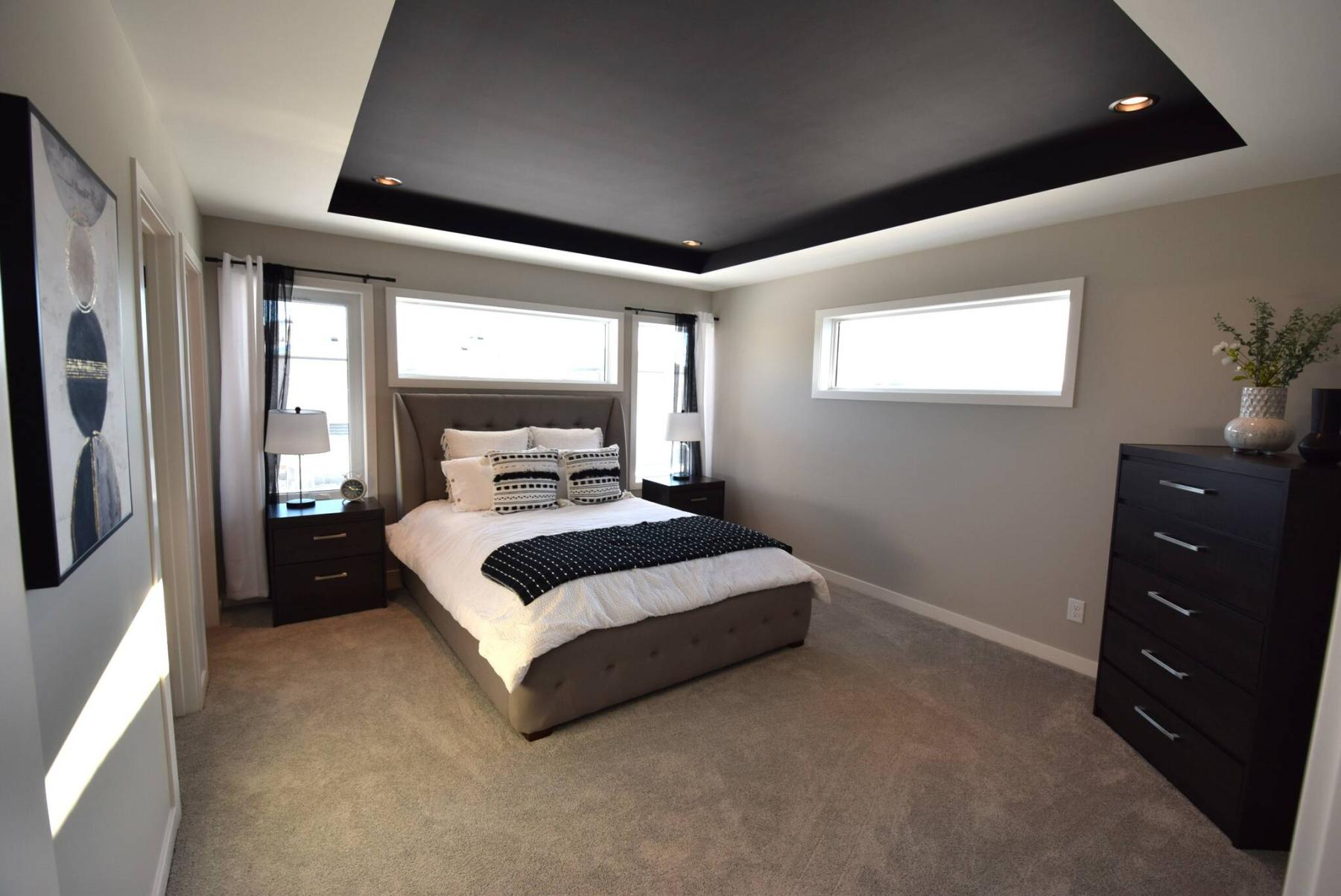 “At about 13 feet by 15 feet, the primary bedroom is huge,” Dundas notes. “It’s defined nicely by a black-painted tray ceiling, while three windows let in natural light and add more style.”
