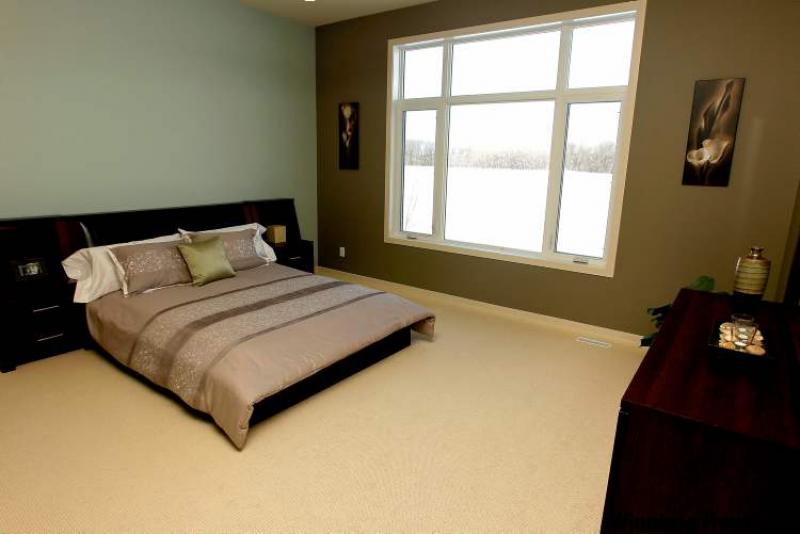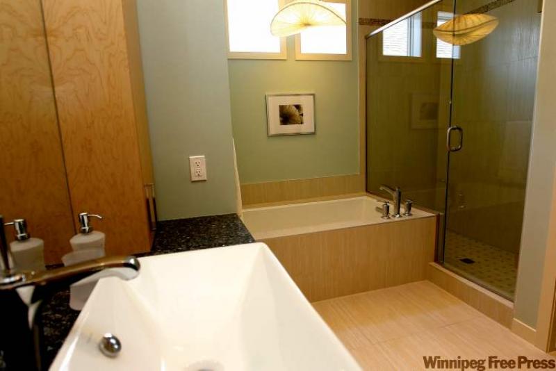 "We went a bit different with the design here. Because there's a short hallway at the entrance, we put the ensuite and walk-in closet off it so they were well away from the bedroom itself," explained Bryant. "The ensuite is just the right size, with relaxing (light blue) colours, a rectangular soaker tub set in the same tan tile as the floor, a huge shower (with dual body sprays) and natural maple vanity with raised white sink. It's a spot where you can just come in and relax."