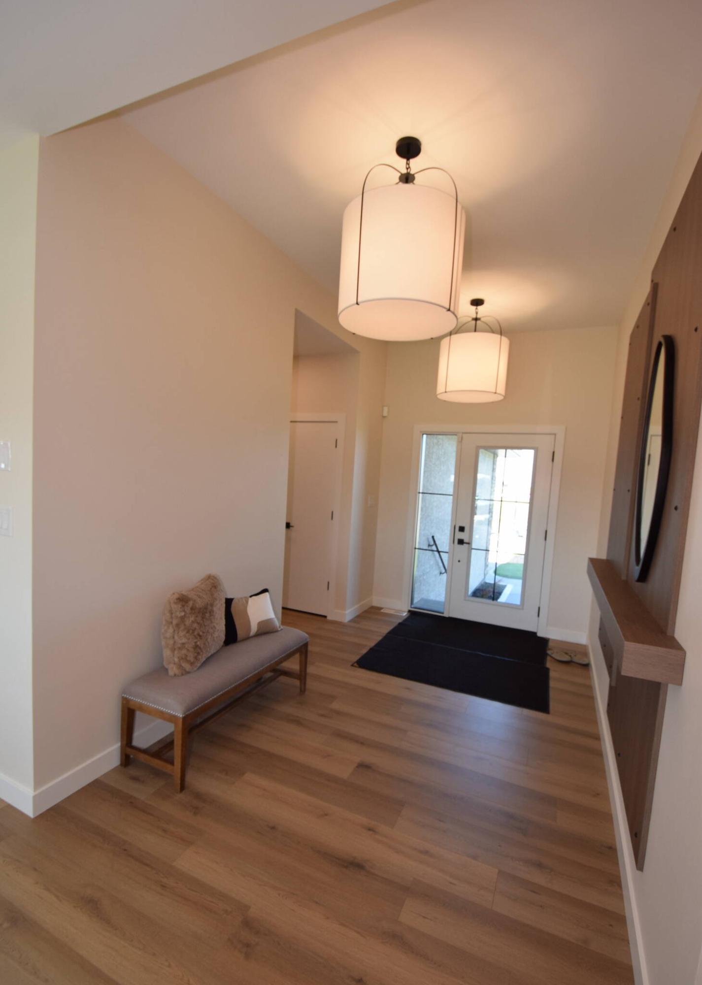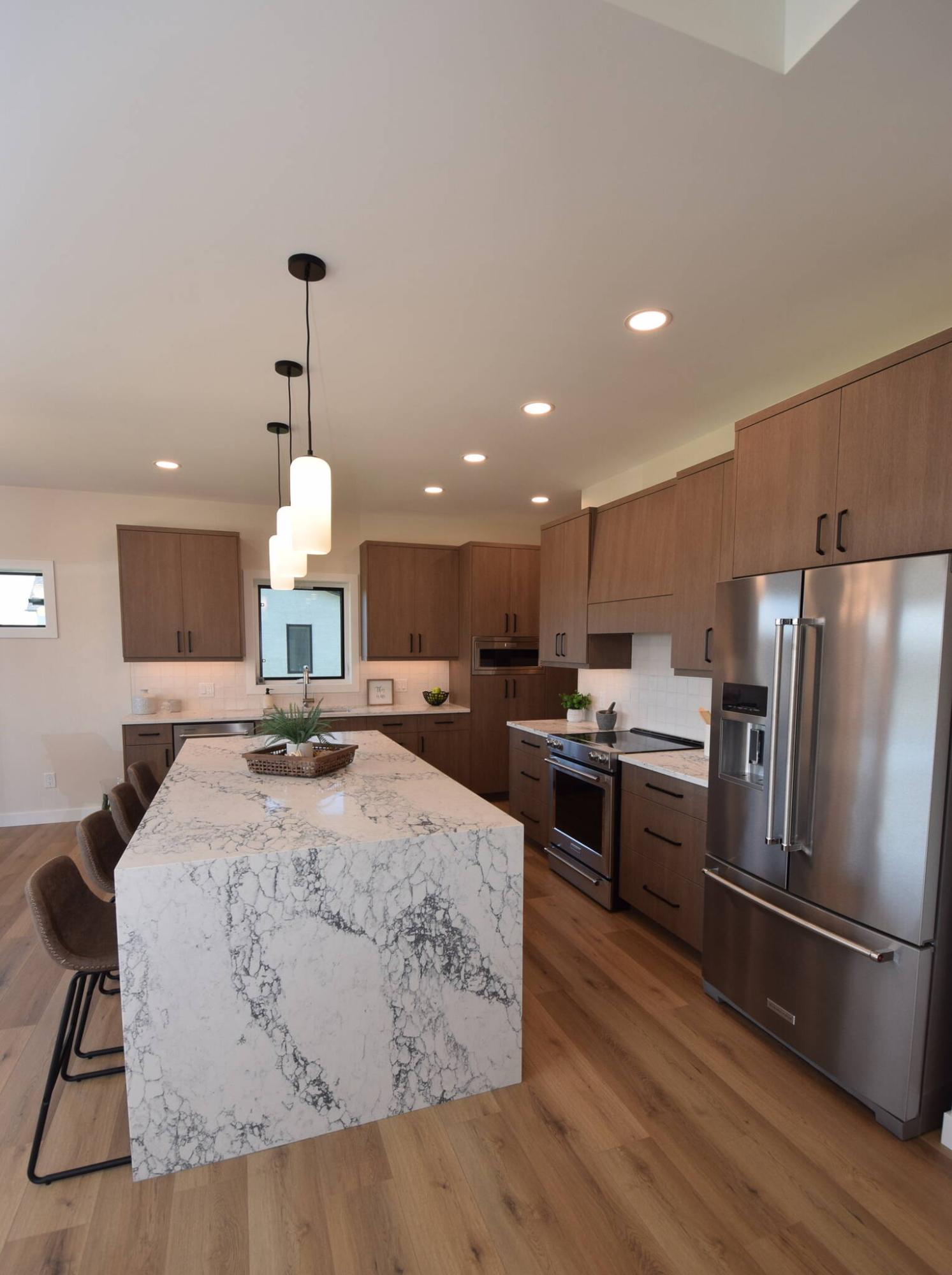 “It starts with the warm wide plank laminate flooring and goes from there,” he says. “Finishing materials — such as the stone feature wall in the great room and wood panels with LED light above in its gorgeous tray ceiling, which ties in with the feature wall in the foyer — complement the flooring perfectly.”