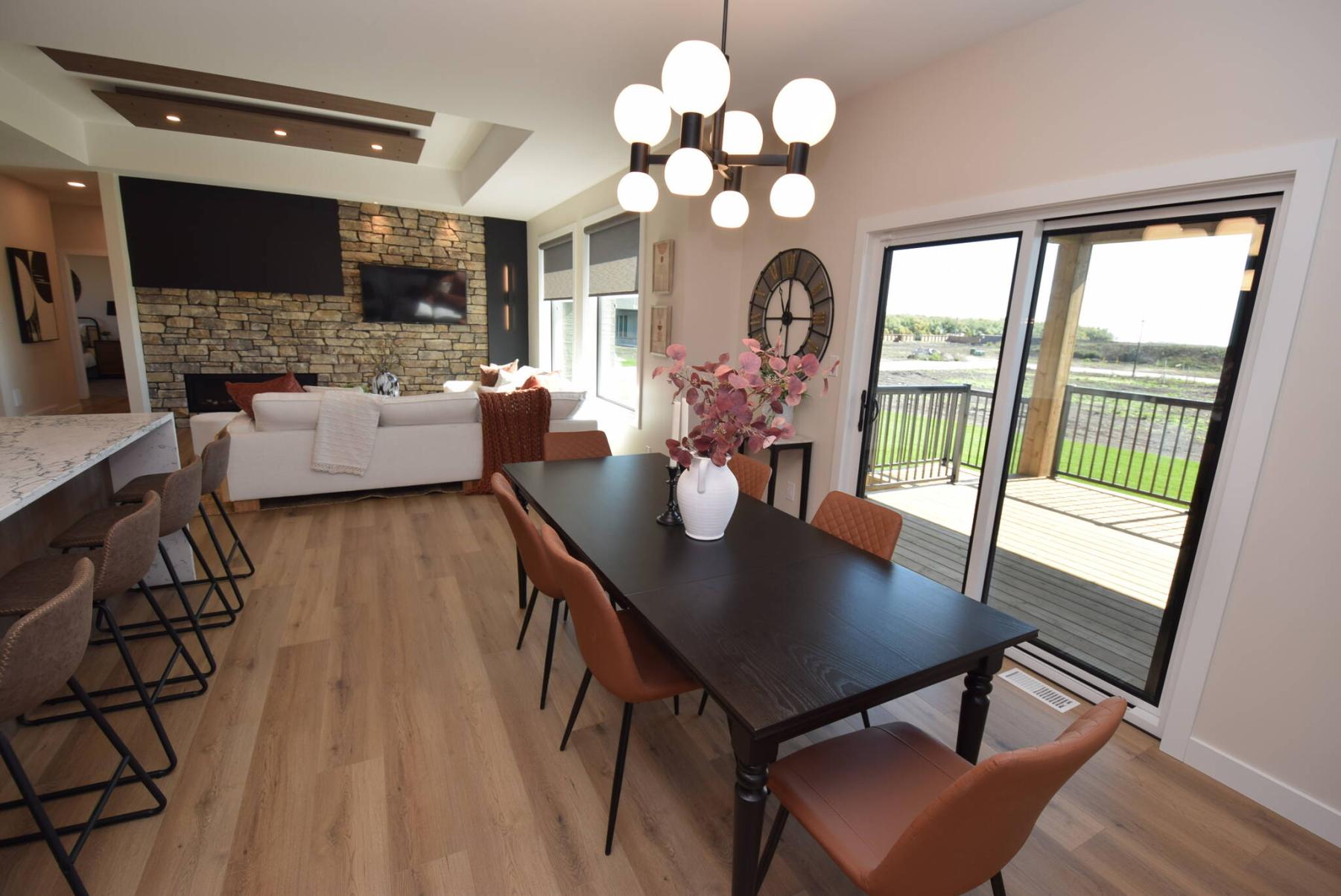 “The dining room can seat up to 10 to 12 guests, and the sliding patio door leads out to a huge, covered deck that’s perfect for entertaining. A 48-inch gas fireplace set in that awesome stone feature wall anchors the great room, while the tray ceiling looks incredible.”