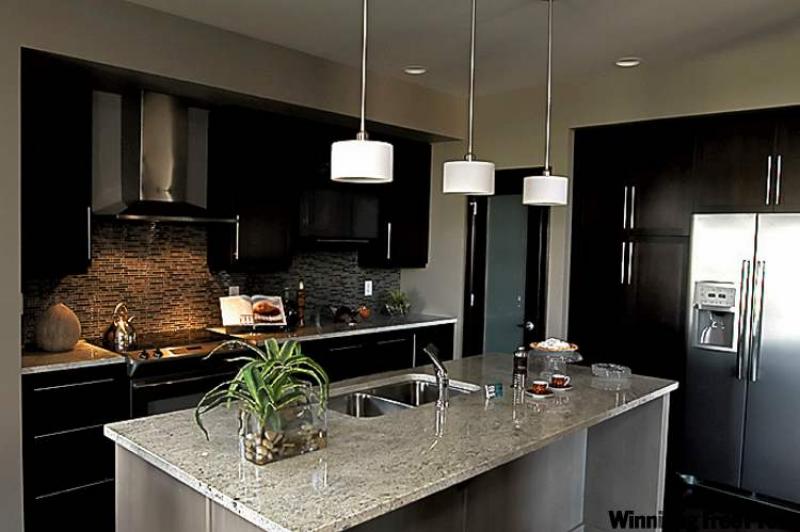 Meanwhile, the island kitchen -- which features a beige granite countertop set on a portobello maple base (a lighter colour that offers welcome contrast to the dark cabinetry and floors) -- has wide aisles for easy access, a two-tone glass backsplash for more contrast and even a pantry with maple shelving. Add in light brown walls with the dark maple floors, and you have a rich, roomy environment.