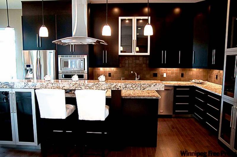 The different finishes are notable for their texture, richness and contrast. The entire floor in the main living area is covered by ebony grey-oak hardwoods, the foyer features high-end (grey/copper/beige) granite, the kitchen has a granite island with long espresso maple cabinets and the family room boasts a stunning white cultured-stone fireplace.