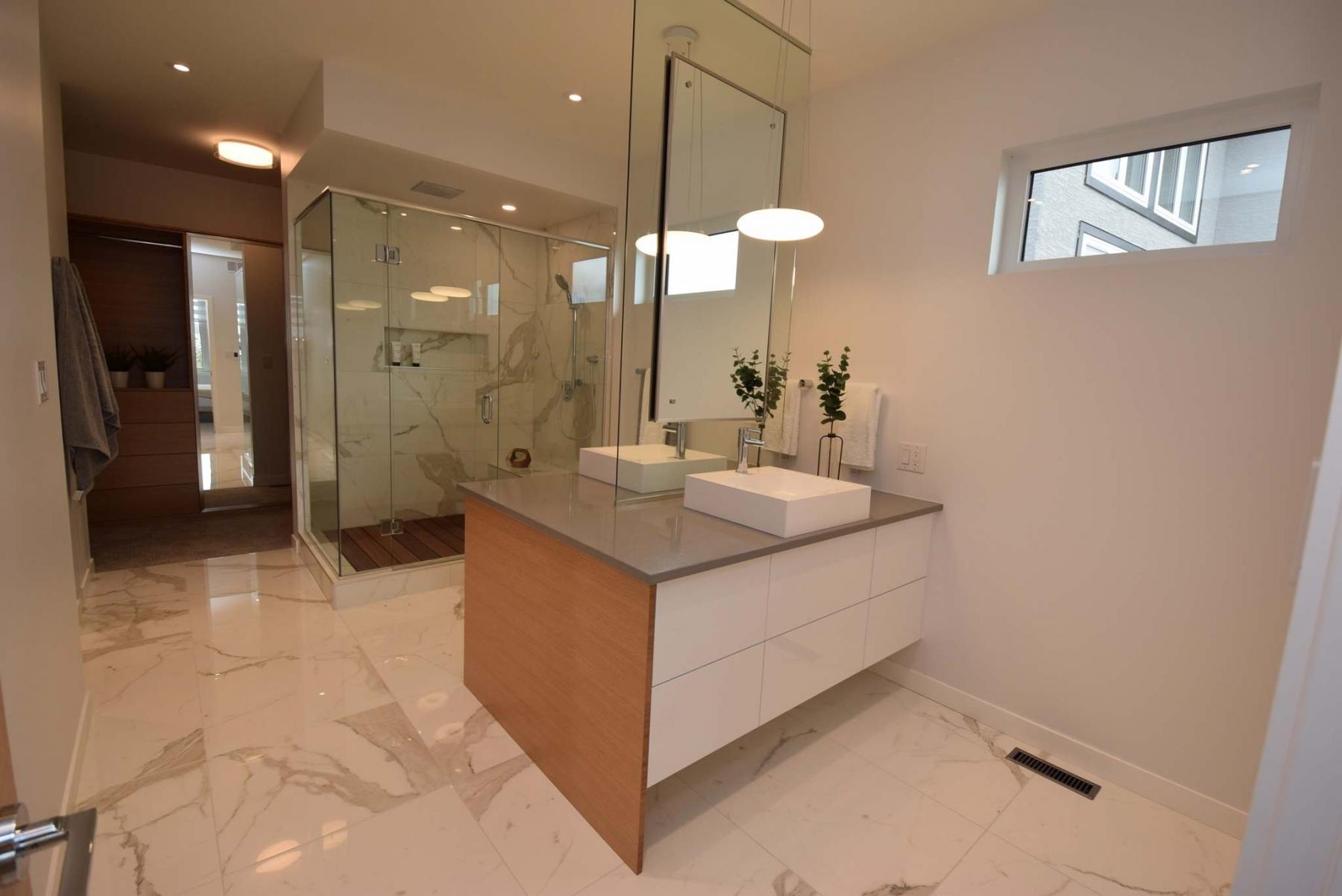 The spa-inspired ensuite boasts a porcelain tile floor, dual vanities and six-foot shower.
