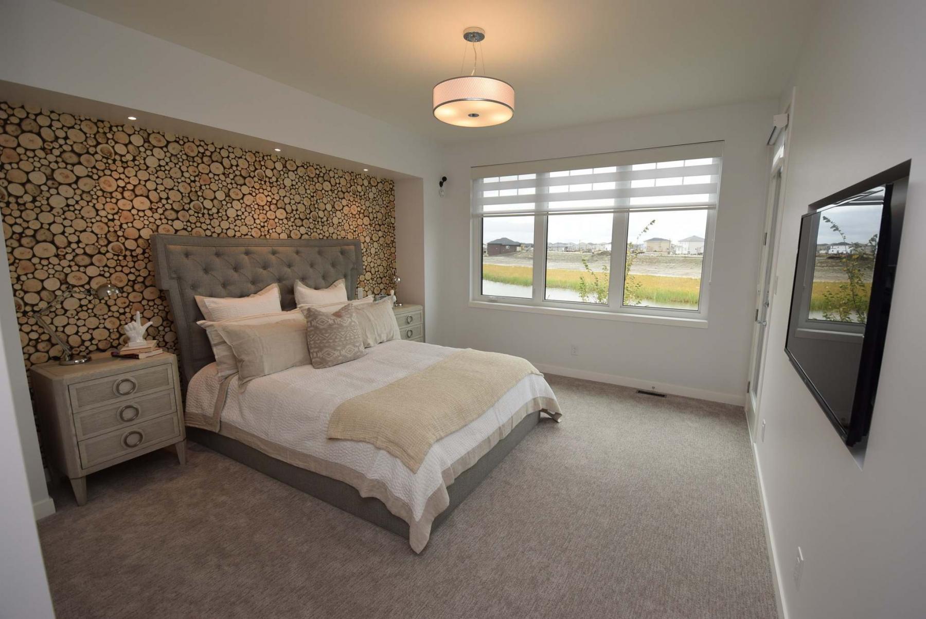 "It has everything you’d want in a master suite — a gorgeous lake view, patio door to the backyard deck that overlooks the water, huge walk-in closet and a spa-inspired ensuite with marble-style porcelain tile floor, dual vanities and six-foot shower with tempered glass enclosure, cedar plank floor, tile surround and rain shower head set flush in the ceiling above."
