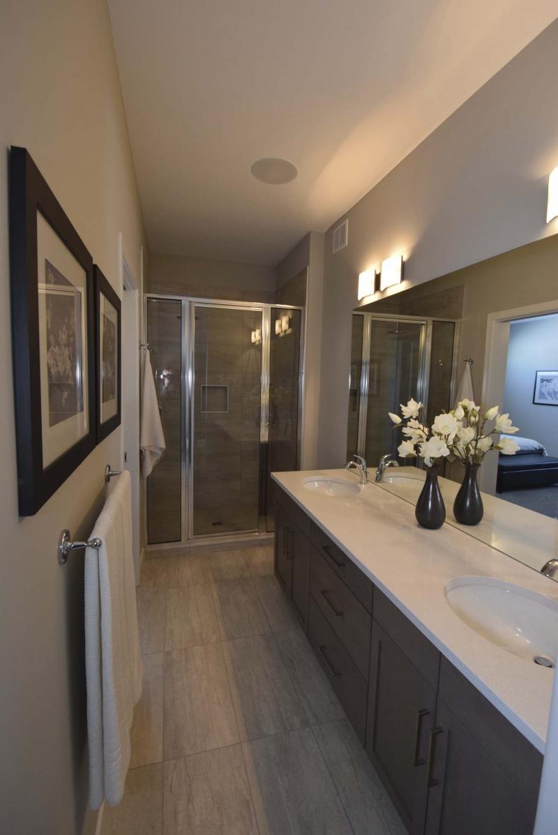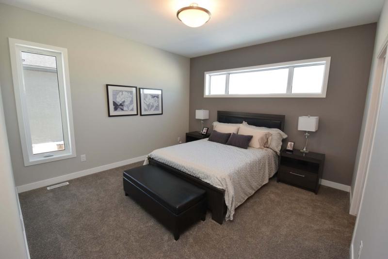"It’s a bright, yet cosy, space. An oversized transom window over the bed and a large vertical window on the side wall let in lots of light while maintaining privacy," says Thorsteinson. "There’s also a good-sized walk-in closet and beautiful three-piece ensuite with heated (taupe) tile floor, tiled shower with rain shower head and maple vanity with quartz countertop and dual sinks."