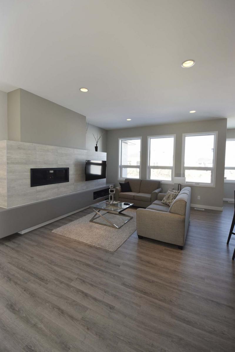 "It stands out with its clean, linear entertainment unit that features a taupe tile backdrop with inset ribbon fireplace (left) and TV niche (right)," says Thorsteinson. "It’s a wonderful space."