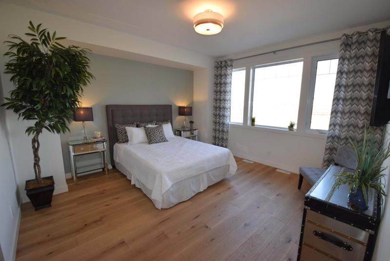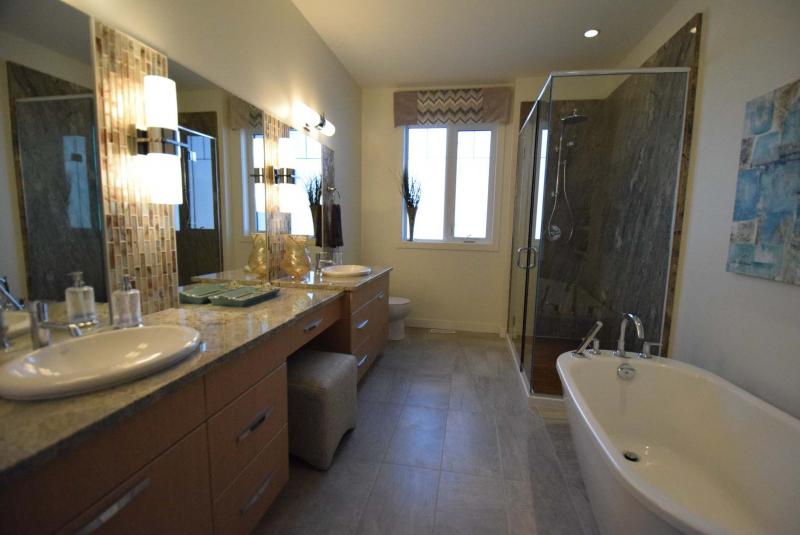 As it should be, the Bergen’s main level is capped off by a palatial master suite. The bedroom itself is big and bright with wetland view, while its other two dimensions — walk-in closet and ensuite — feature a perfect synergy of fashion and function. "The walk-in closet is huge, comes with built-in open-slat (honey tinted) pine storage, plus another mirrored closet with tons of built-in organizers," he said. "The piece de resistance is the ensuite, with its walk-in shower with solid (grey) granite surround and teak slat floor, free-standing soaker tub and heated tile floor. The master suite is an area where grandeur and practicality meet in seamless fashion."