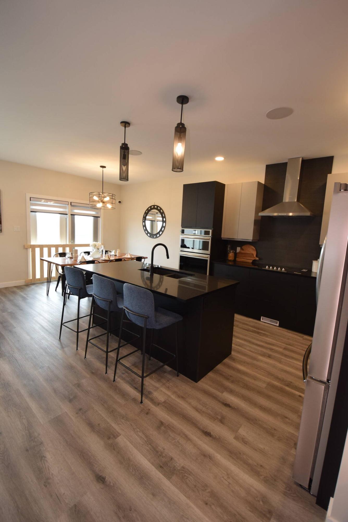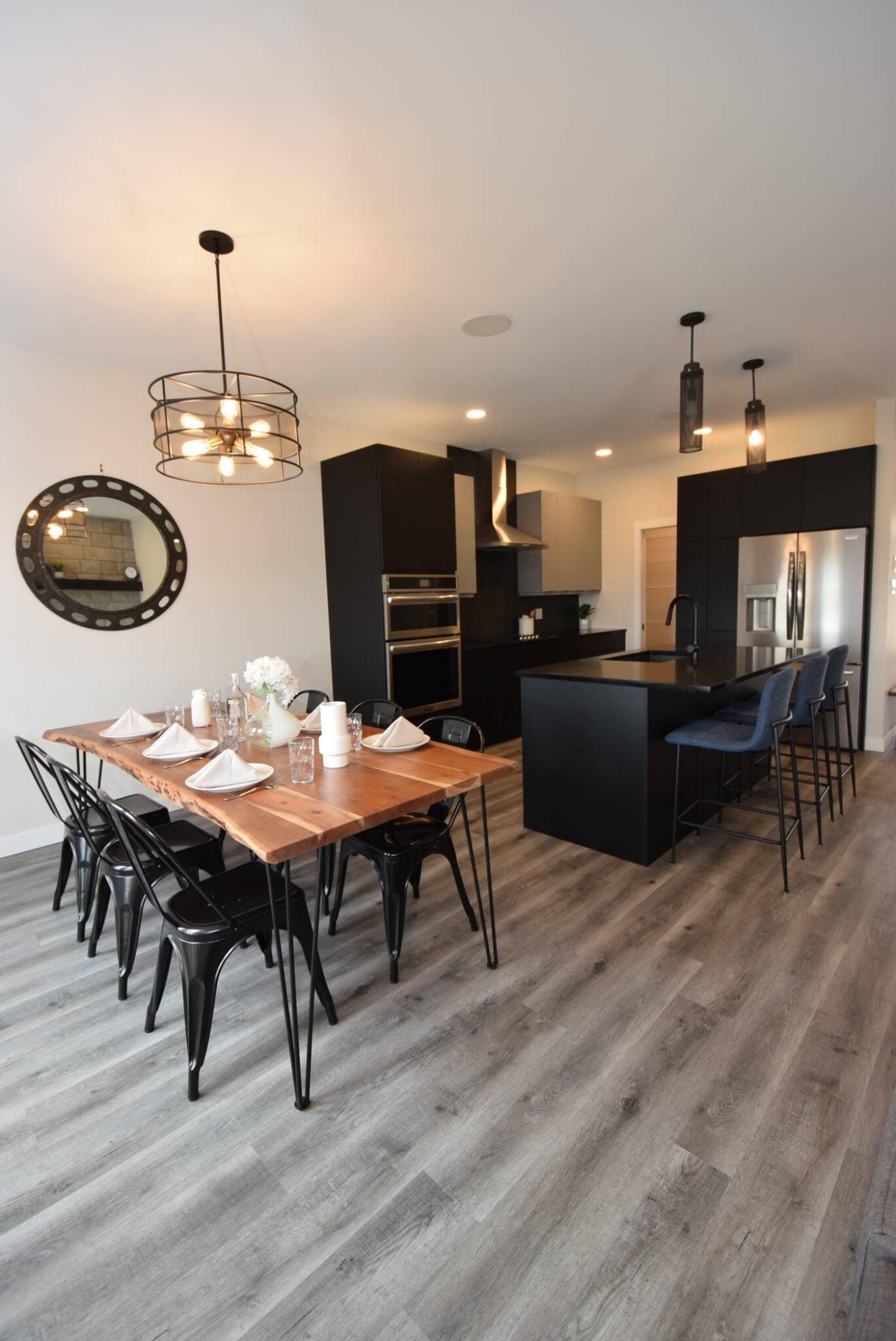 Warm laminate plank flooring bridges the gap between contemporary and country, while a colour palette consisting of taupe, grey and black shades mesh perfectly to give the open-concept area a nice, inviting feel.