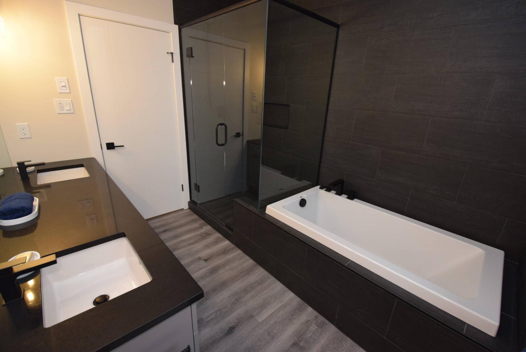 The ensuite is so nicely done with a tiled walk-in shower, soaker tub set in the same charcoal tile and a grey vanity with black granite countertop and dual sinks.”