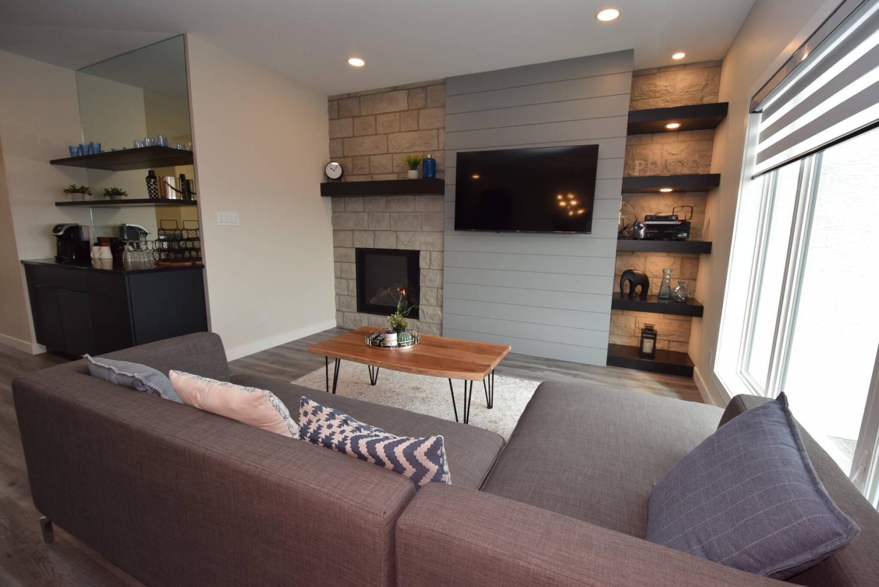 A gas fireplace with stone surround, grey shiplap TV wall and five-tired open shelving unit with stone backdrop endows the family room with an inviting modern rustic feel.