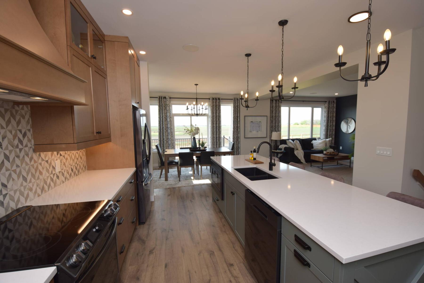 “Maple cabinets add to that country feel and go nicely with white quartz countertops and a multi coloured ceramic tile backsplash. A 10-foot island with modern grey/green cabinets and black fixtures adds a modern touch along with gunmetal stainless appliances. I also love how wide the aisle is between the island and range. Just look how much space there is to move around.”