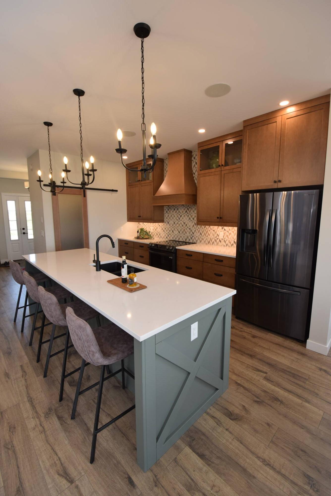 “That modern farmhouse vibe is built upon by the natural materials that were used in the main living area,” says Tabitha Beate of Keller Williams Real Estate, the sales representative for the two-storey, 2,213 square-foot home. “All the different materials work really well together to create a modern country feel.”