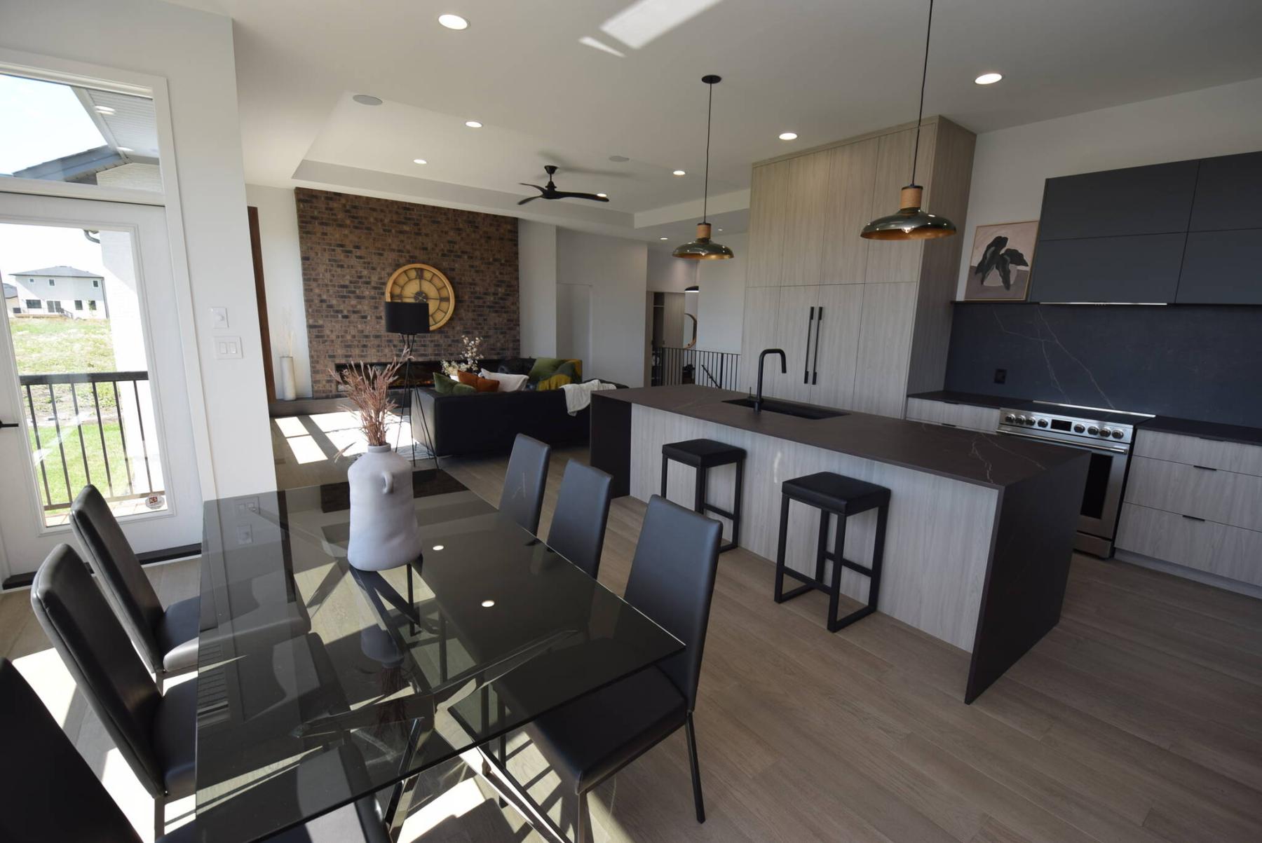 “A brown brick, floor-to-ceiling feature wall was put on the side wall to work with the engineered oak flooring to make the great room feel even more inviting and cosy,” he says. “It features a 100-inch linear electric fireplace that adds a perfect modern touch. A tray ceiling above defines the space and takes the ceiling height up to 11 feet.”
