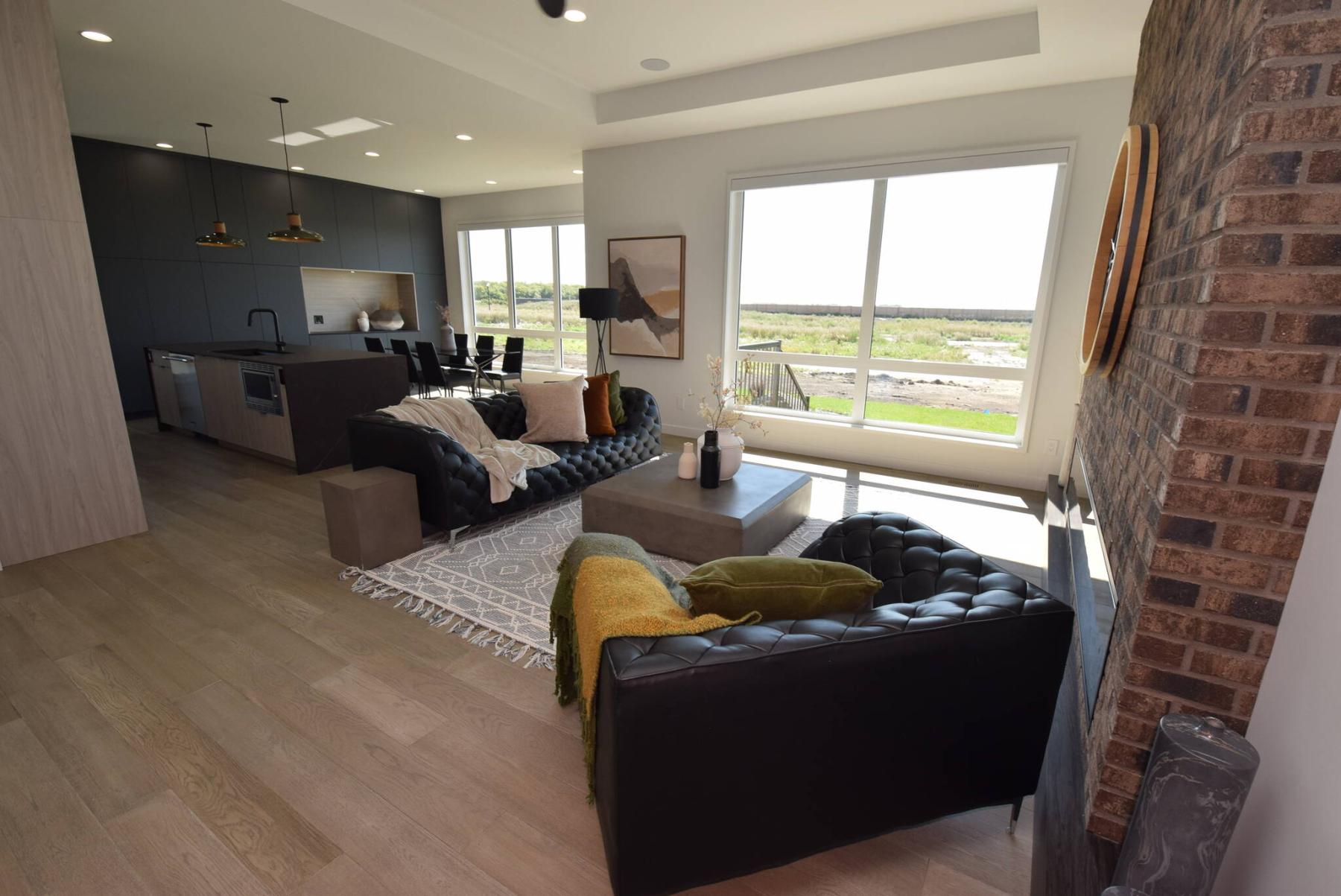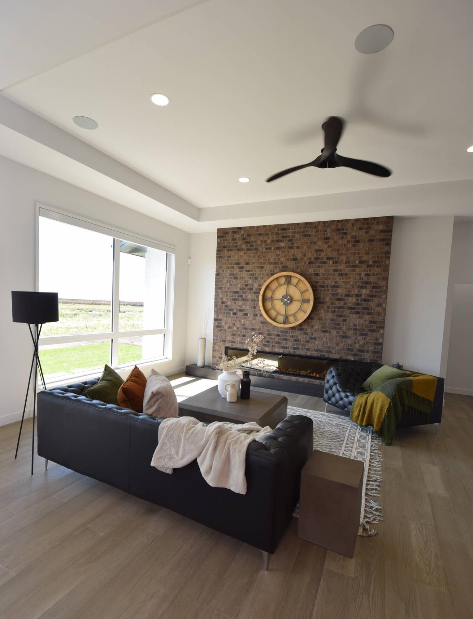 A floor-to-ceiling brick feature wall with linear fireplace serves as the centrepiece of the great room at 8 Bryce Blvd. in Oak Bluff West.