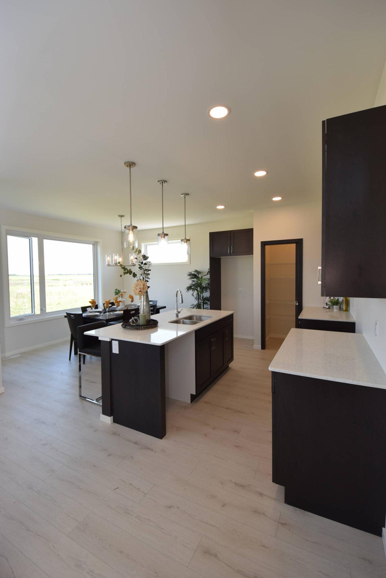 “I really like how the cappuccino maple cabinets go so well with the flooring, which is a lighter brown with darker highlights that tie in with the cabinets. The off-white quartz countertops add contrast and texture, while a corner pantry adds function.”