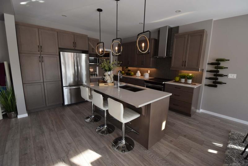 "People love the Thunder (maple) cabinets in the kitchen with their beautiful stain and crown mouldings, along with the earthy glass tile backsplash and taupe quartz countertops. In the family room, the TV niche (with its light/medium taupe cultured stone backdrop) creates a focal point that’s simple, yet effective — it’s not overdone."