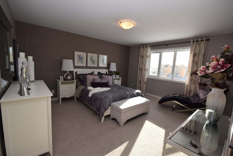 "A huge window lets in tons of natural light, while the ensuite offers a heated (taupe) tile floor, eight-foot vanity (a standard feature), four-foot shower — and attached walk-in closet at the back of the ensuite. The design is very convenient, as you can shut the door, shower, and then dress inside the ensuite without disturbing your partner."
