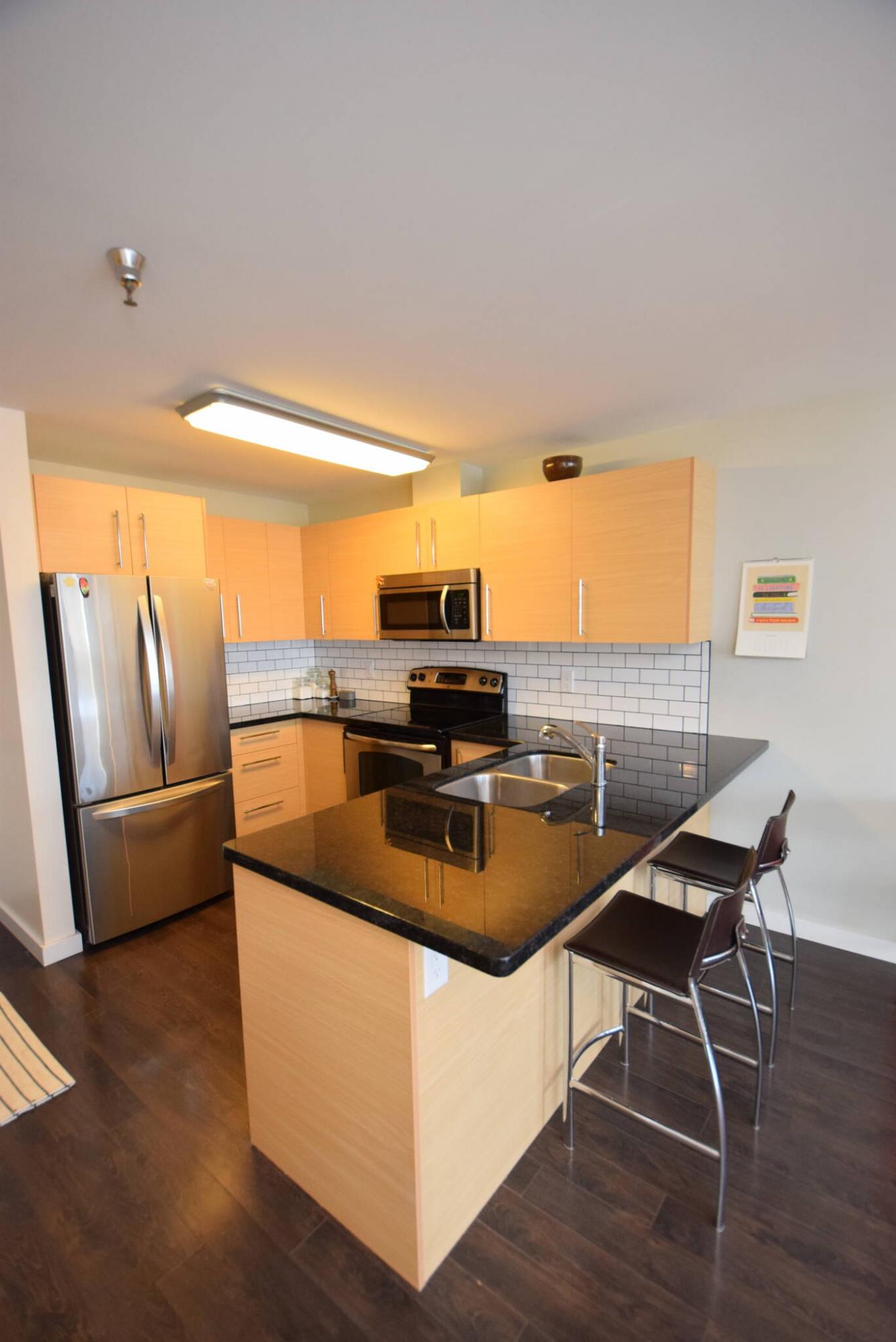 The peninsula-style kitchen is roomy and features contemporary finishes.