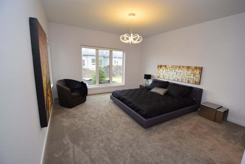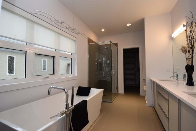 "The bedroom is just a perfect size with a large picture window and room for a reading chair, while the ensuite is a spa-like retreat. Pretty much everyone who’s gone through the home has loved its stand-alone soaker tub, four-foot custom shower, tile floor, thermofoil/quartz vanity and big walk-in closet with built in storage by For Space Sake."