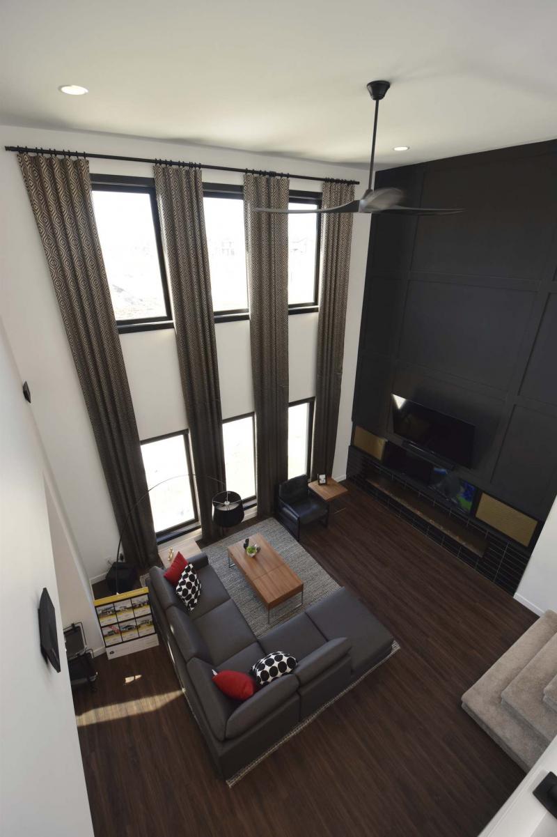 The Bloom’s family room features an 18-foot ceiling, floor-to-ceiling windows and a floor-to-ceiling entertainment-unit wall.