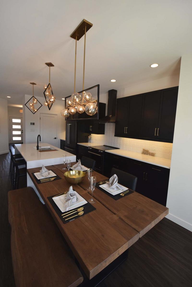 "It’s a wonderfully designed space that offers a perfect synergy of style and function with its eight-foot island and gorgeous, built-in wooden dining table. The table can seat five to six, while the island can seat three to four. The black-maple cabinets pop on a raised white tile backsplash, and the off-white quartz countertops add a touch of elegance."