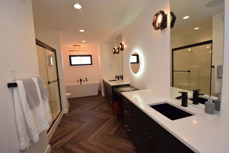 "The herringbone LVP flooring flows into a relaxing space that features two luxurious black maple vanities with makeup desk, a floor-to-ceiling tiled shower, and a deep stand-alone soaker tub that was placed at the back beneath another large, black-trimmed window. It’s a wonderful spot to get up to in the morning or relax in after a long day at work."