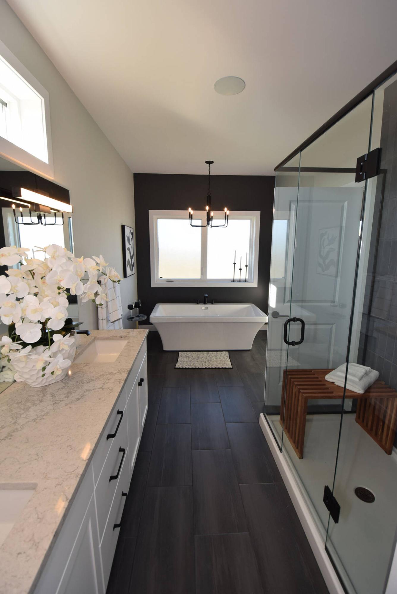 A free-standing soaker tub is the elegant ensuite’s main attraction.