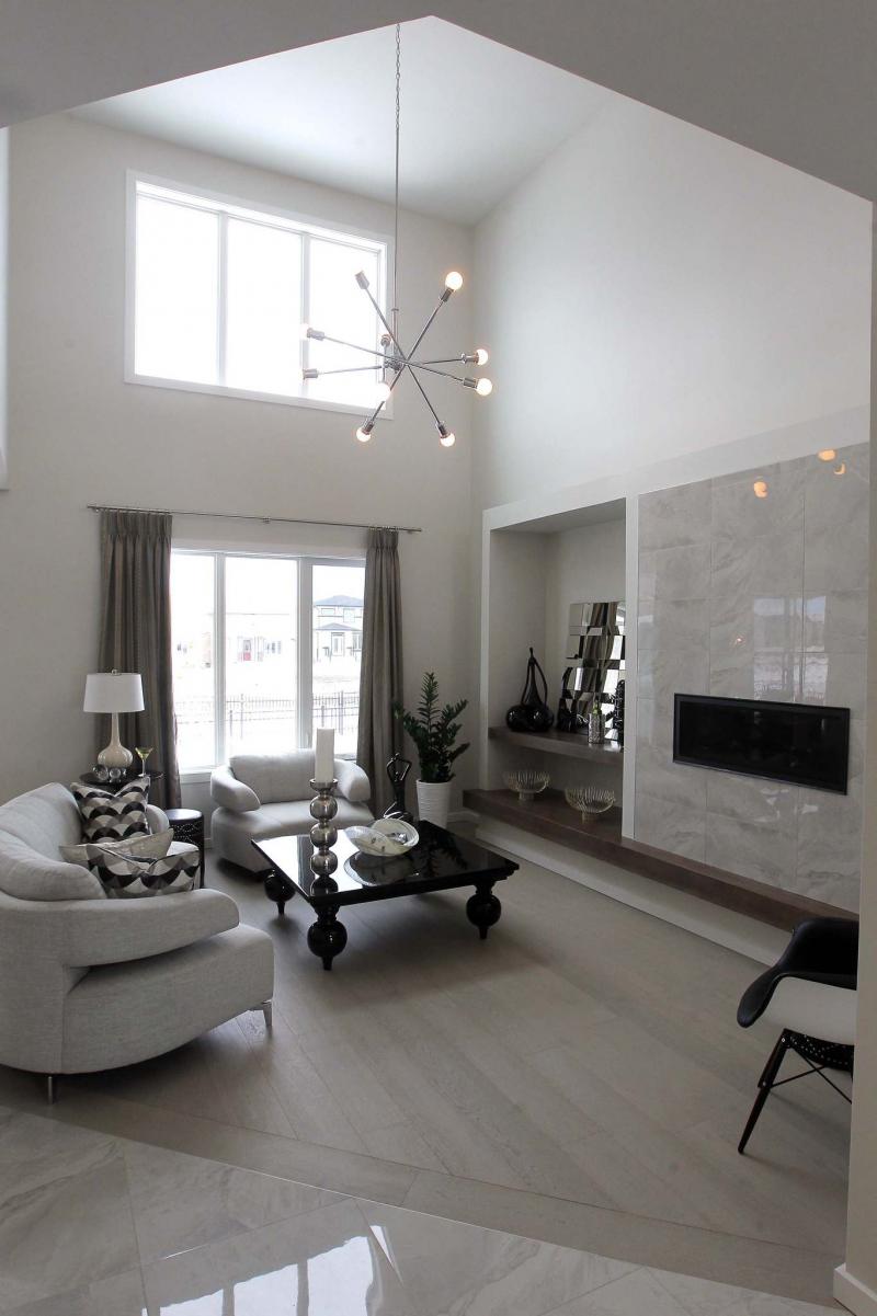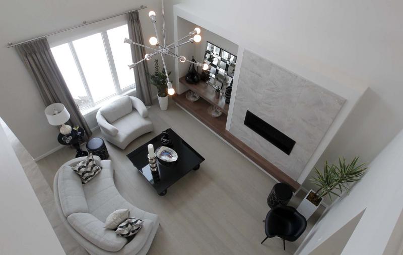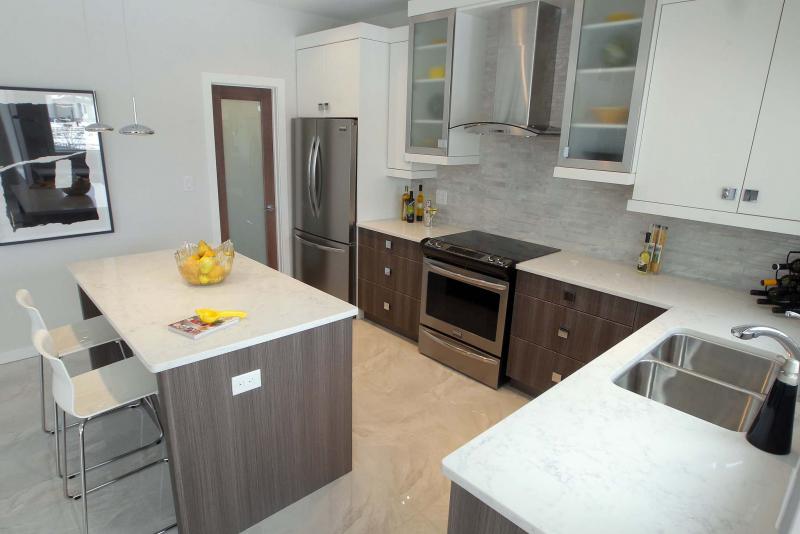 Other little touches then come together to give the great room a classy, understated sense of style. "One of the things we did was put in quartz countertops with a marble look that matched the flooring," he says. "For colour contrast in the kitchen, we used antique white cabinets higher up, and then put rich (walnut) thermofoil cabinets down low. There’s also a gorgeous tile backsplash and the mid-sized island seats two."