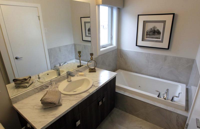 Parents will also appreciate the master suite at the end of the day, Curtis adds. "It features an angled double entrance that takes you into a bedroom that’s just the right size — it isn’t too big or too small. A huge window lets in tons of natural light, while a large walk-in closet provides plenty of storage space. It’s capped off by a deluxe ensuite with marble tile floor, jetted soaker tub, four-foot shower and thermofoil/quartz vanity."