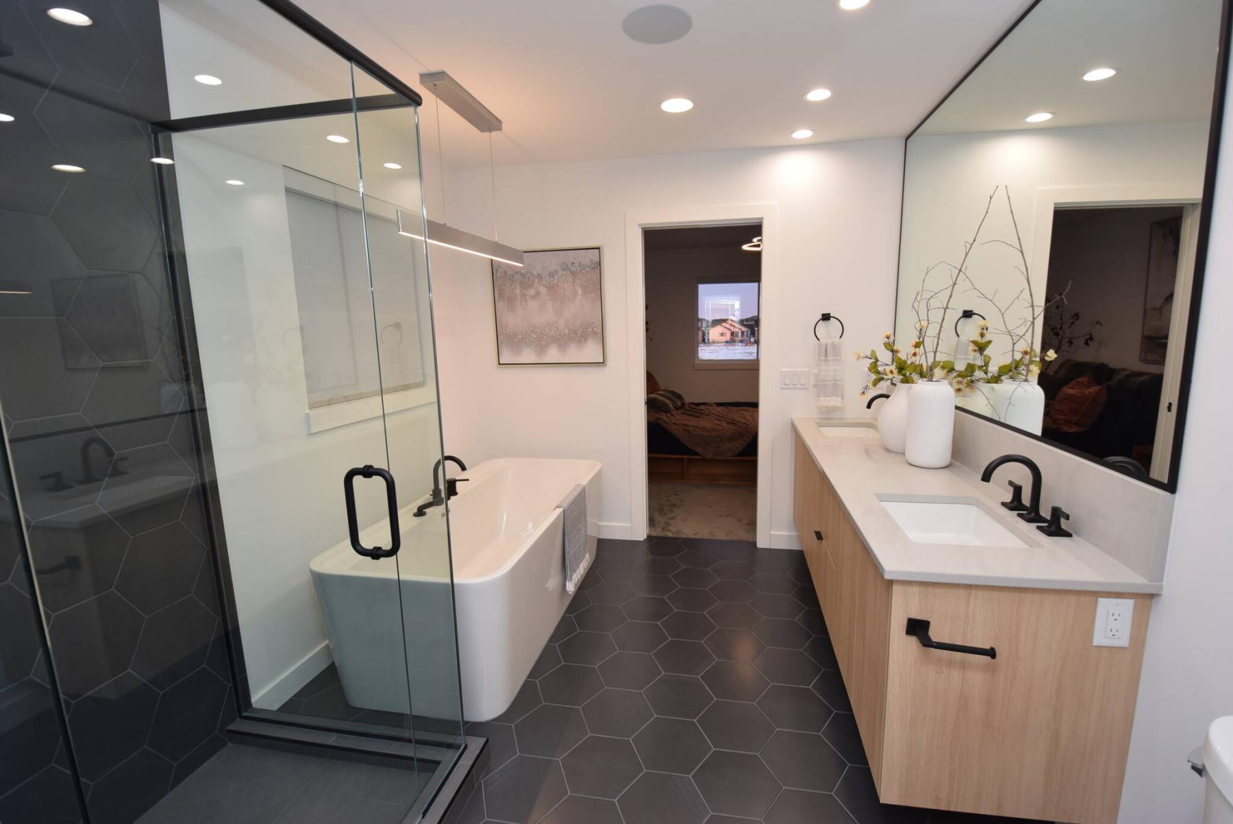 “I really like how the bedroom was sheltered even more by putting it behind the ensuite. It’s a stunning, spa-like space that features a huge soaker tub, walk-in shower, hexagonal charcoal tile floor and a rift-oak-style floating vanity with quartz countertop and dual sinks. The walk-in closet also has custom millwork.”