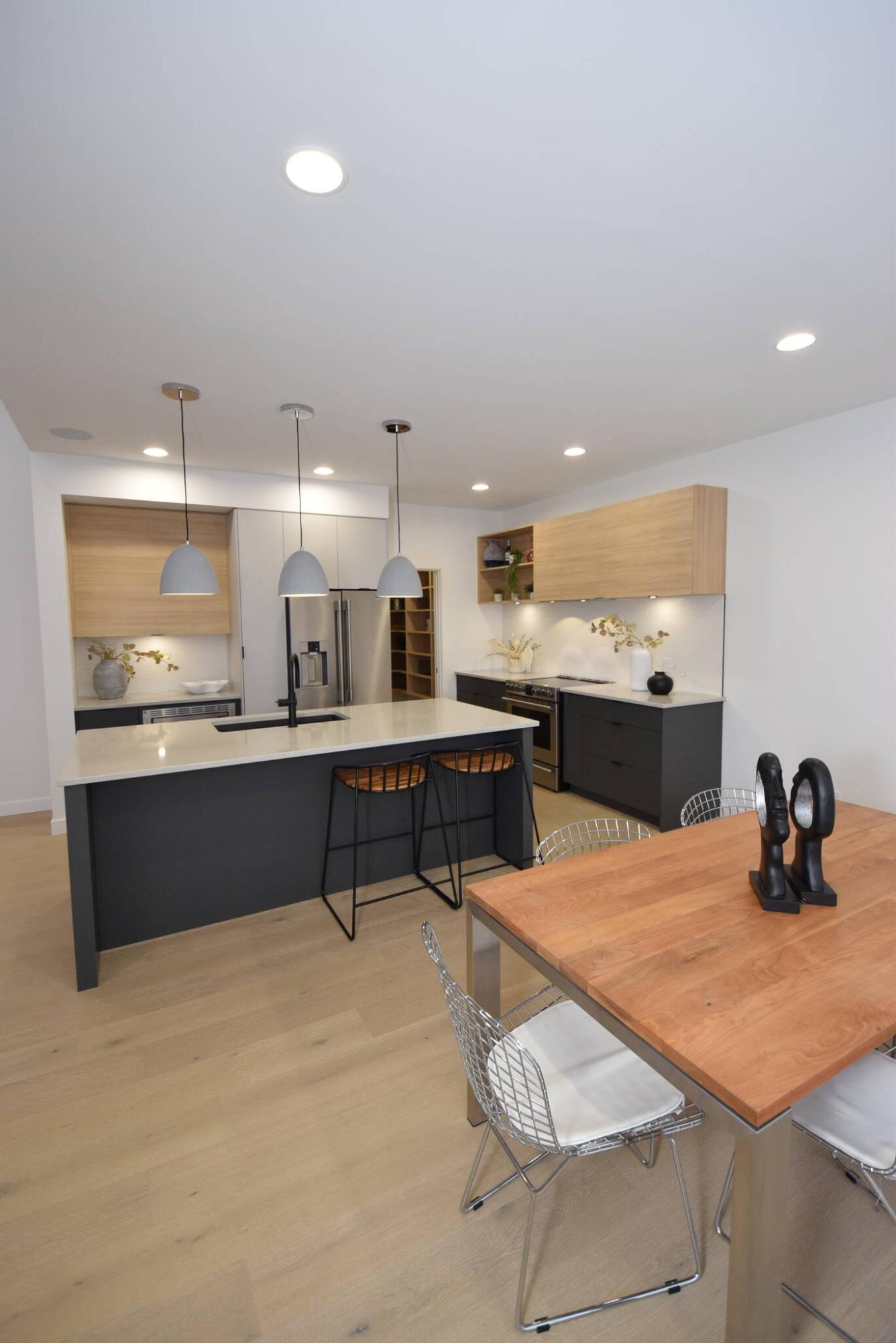 While the island base and lower cabinetry is a modern charcoal grey that meshes beautifully with quartz countertops interspersed with shades of grey, taupe and white, the Euro-style upper cabinets were finished with a rift-oak-style veneer rather than white.
