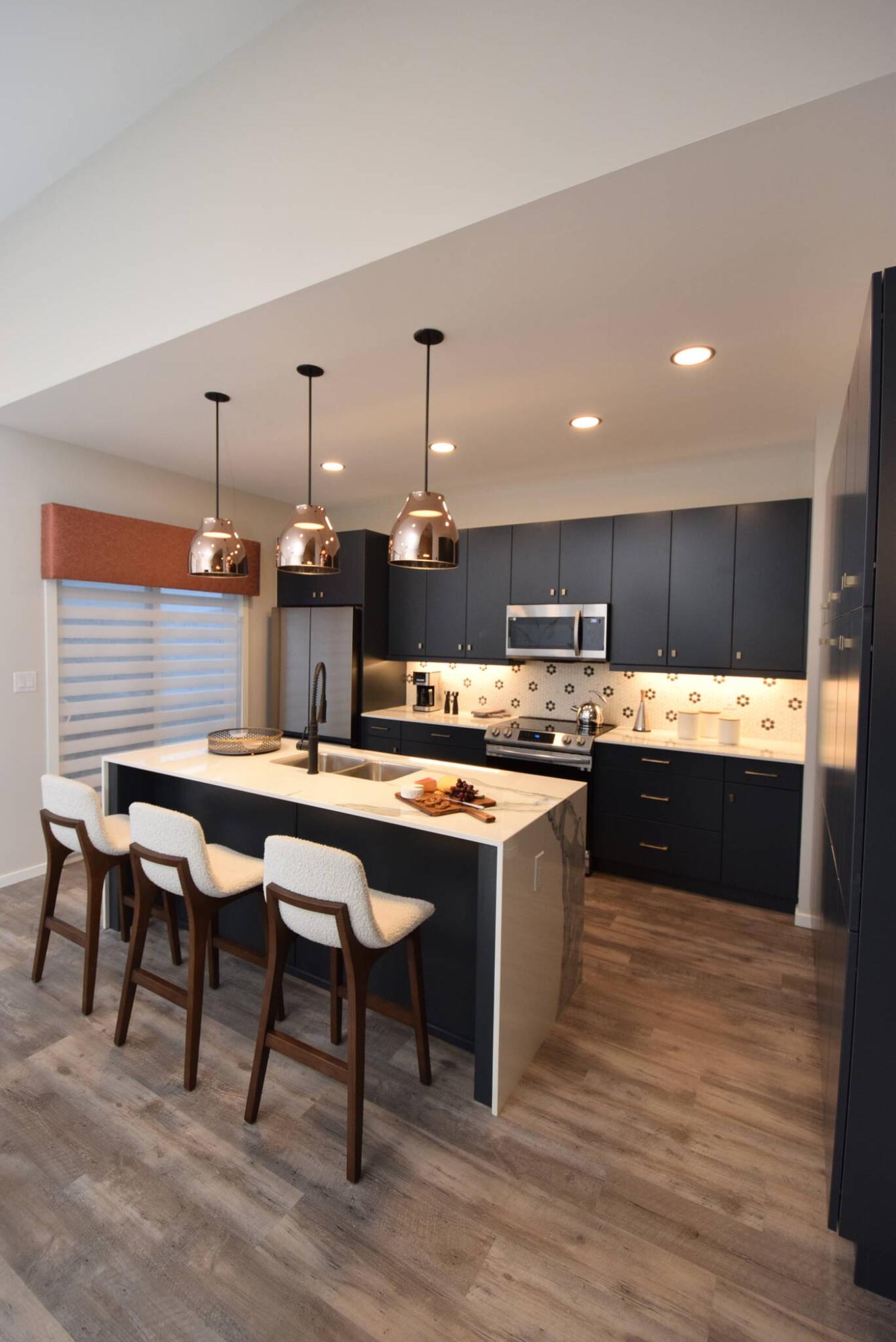 “It’s just a gorgeous space and was designed for the home’s resident chef with its mid-sized island, a huge wall pantry, tons of charcoal grey cabinets and beautiful quartz-style laminam countertops,” he says. “Big, gold pendant lights over the island and a hexagonal tile backsplash finish the kitchen off with a nice bit of style and texture.”