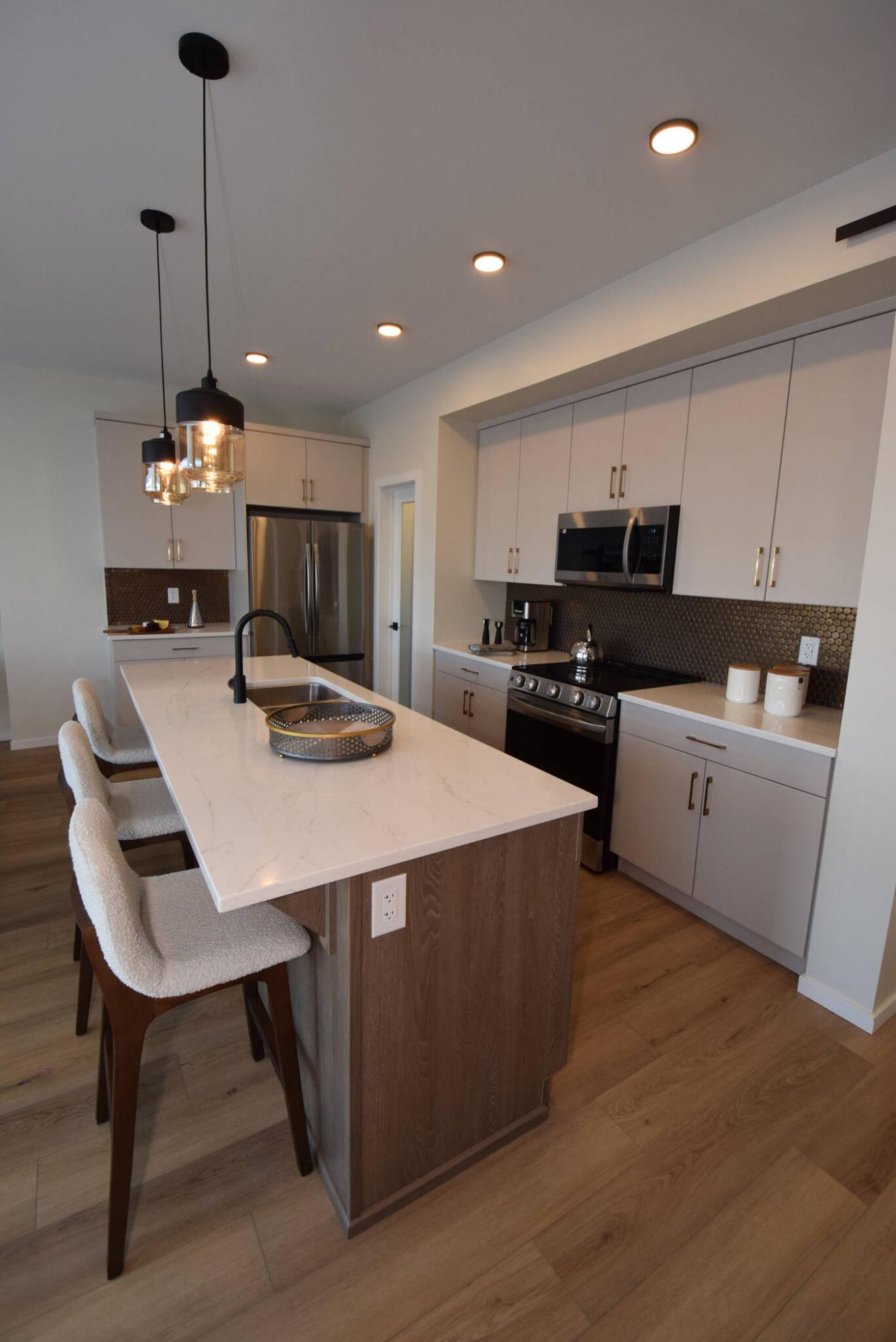 “The darker-taupe veins in the countertops add an extra bit of texture, while the lights — we spent a lot of time sourcing them — add punch and style. Everything works so well together. A great room with linear electric fireplace set in a grey-tile surround with subtle rust tones and spacious dining area next to a large window finish off the main living area perfectly.”