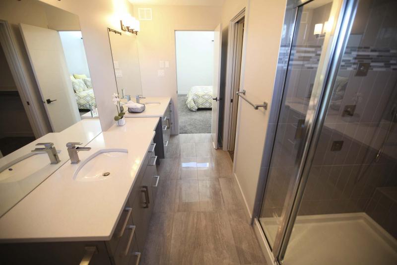 Granted, the two secondary bedrooms are impressive due to their space and own well-placed window collections (one bedroom has no fewer than three), it’s the master suite that steals the show. Again, glassification is a theme, with five windows set up high, taking advantage of the presence of another vaulted ceiling. A pair of corner windows let more light in down a ground level. "Those windows up high on the side wall allow the morning sun to shine in — it’s a nice way to wake up," Ftoma says. "Then there’s the ensuite. In a word, it’s amazing. It starts off with a gorgeous (striated taupe) tile floor, and features a a vanity with quartz countertop, dual sinks and a makeup table in between the sinks. The (deep) five-foot custom tile/glass shower is incredible. It has a rain shower head, wand and three body sprays."