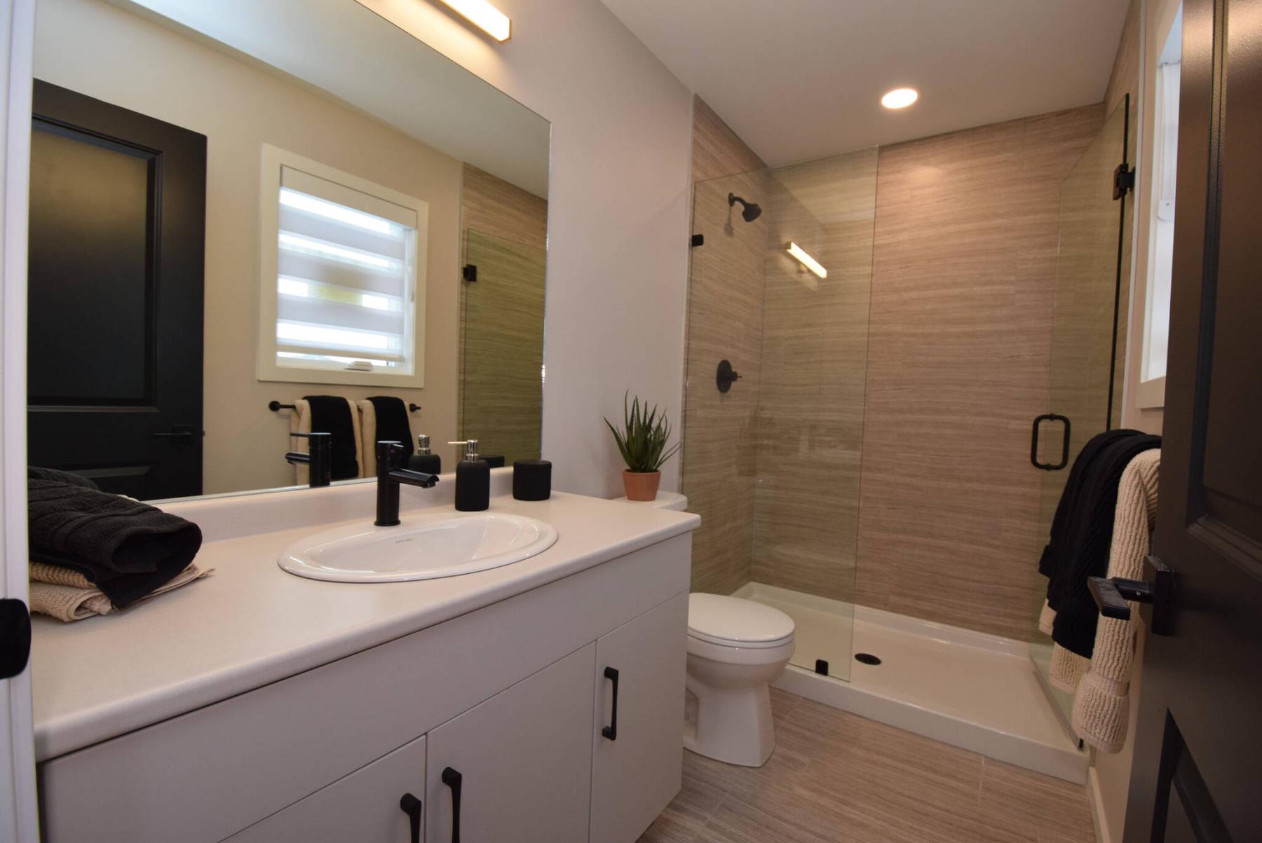 “To start things off, the view down to the great room is amazing,” Frederiksen says, adding that there’s the option of an open-to-below view as in the show home, or a loft. “Like the main floor, the floor plan is very efficient.”