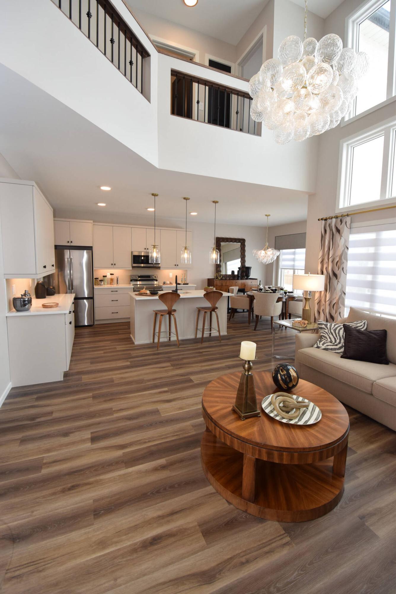 In Hilton Homes’ Prairie Pointe two-storey Hazel design, the island kitchen’s earthy finishes mesh perfectly with luxury vinyl-plank flooring that endows it and the adjacent spaces with a welcoming warmth.