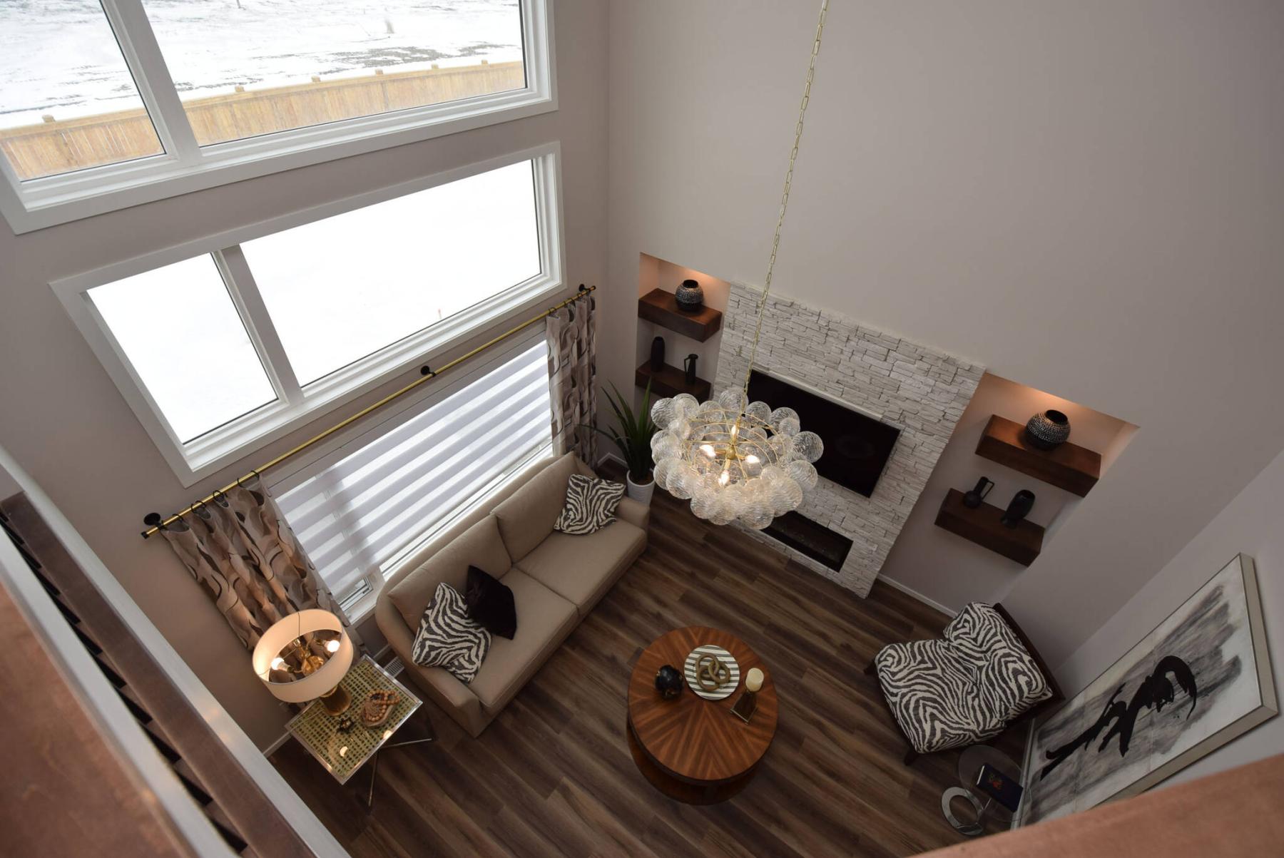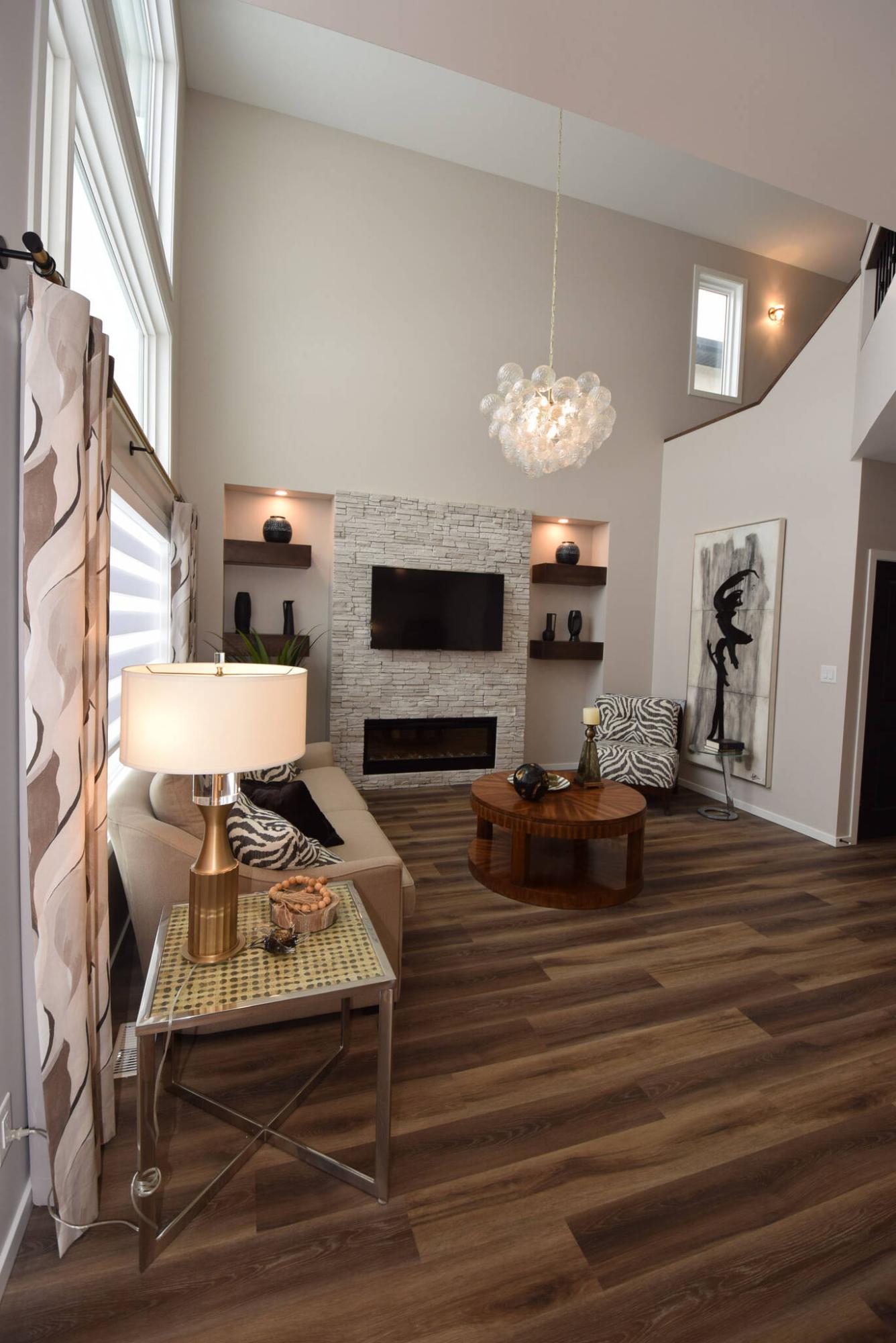 Look to the right, and there’s the great room, a light-filled space with floor-to-ceiling windows that exudes a sense of volume and modern warmth with a cultured-stone feature wall with linear-electric fireplace and cappuccino-stained open shelving, providing a classy focal point.
