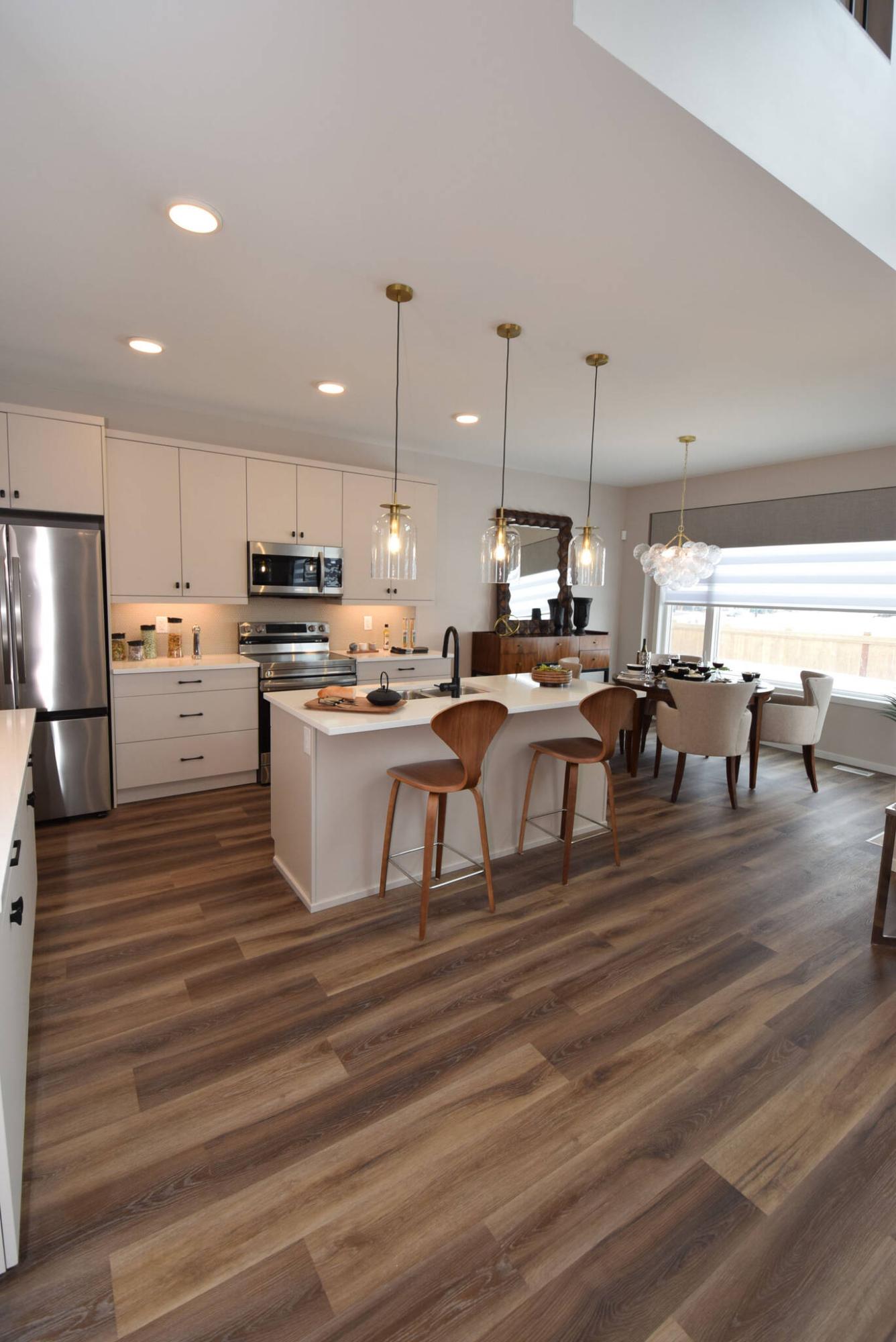“Like the great room, it’s filled with natural light,” says Frederiksen. “It’s not a very bright day out, but the main living area is still bright due to the big window behind it and the windows in the great room. The luxury plank flooring is just the right colour, adding warmth along with light-taupe cabinets and a cream, hex-tile backsplash.”