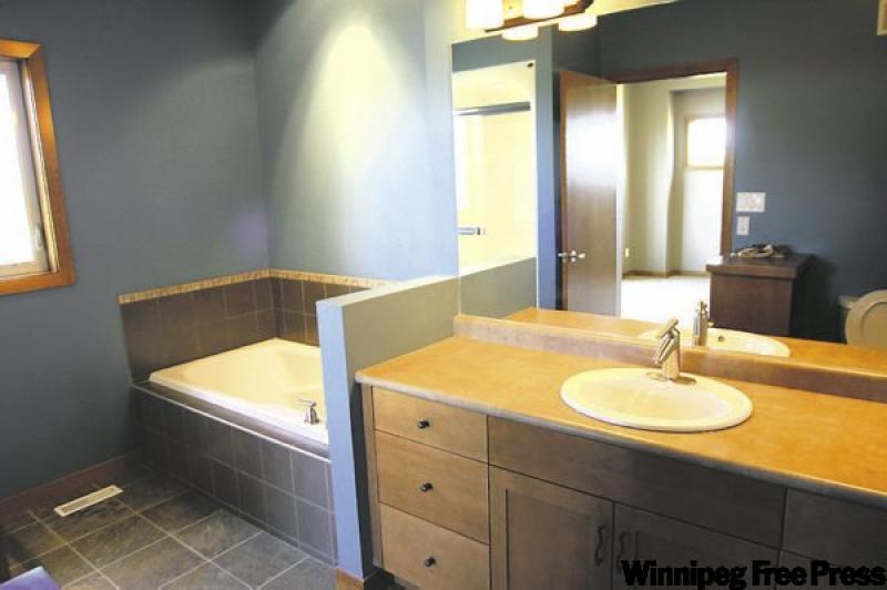 'The designers went with a different colour in the ensuite, a kind of turquoise. It's a warm, relaxing colour that goes well with the white jetted tub, which is set in grey ceramic tile with beige trim. The maple vanity with raised (white) oval sink, and clear tempered-glass shower enclosure, finish it off nicely."