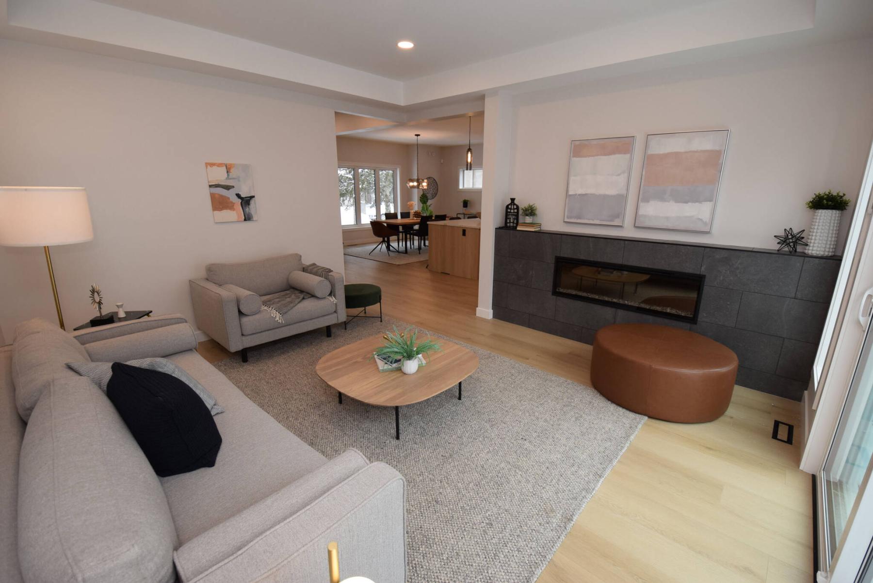 The great room is a cosy space that features a linear electric fireplace set in a grey, low-profile feature wall.