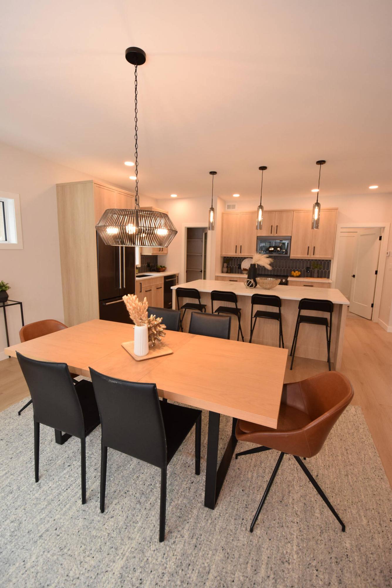 “The blond-coloured high-end wide-plank laminate flooring, is the perfect colour, being bright yet warm at the same time. Large, well-placed windows — one behind the dining area and three windows plus a sliding patio door in the great room — also let in lots of natural light.”